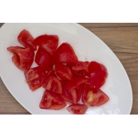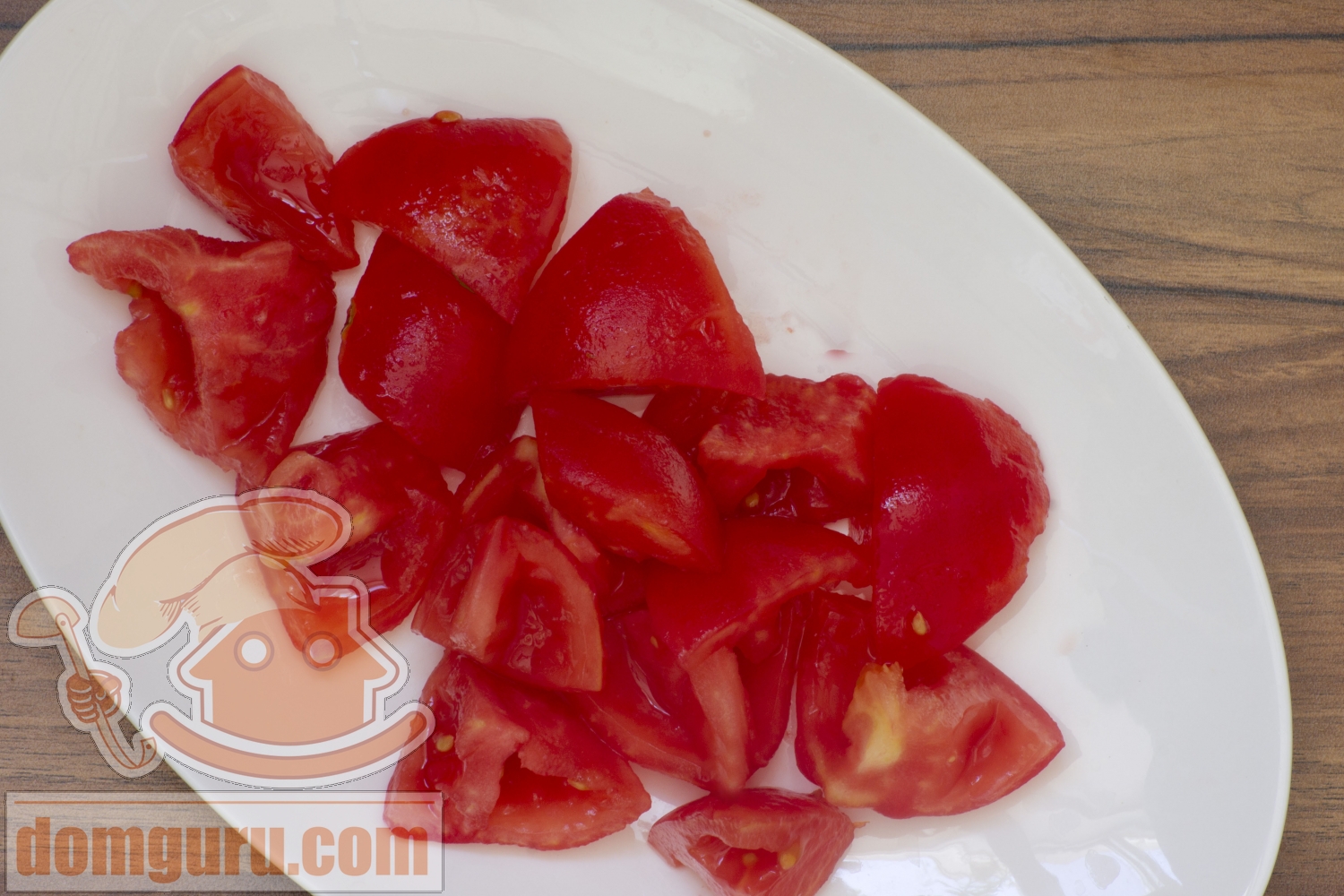 Помидоры промойте, удалите шкурку, нарежьте крупно и удалите внутреннюю часть.