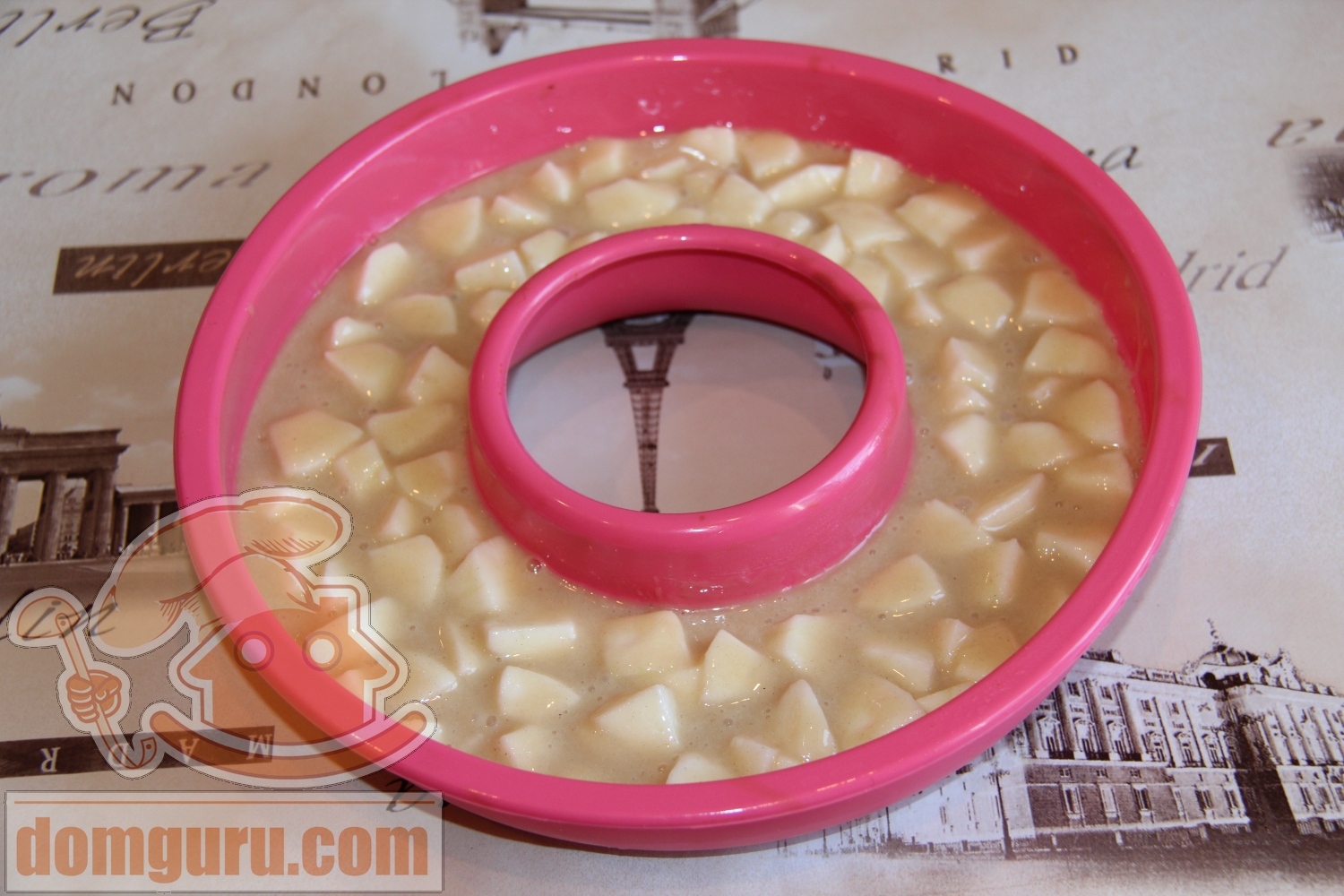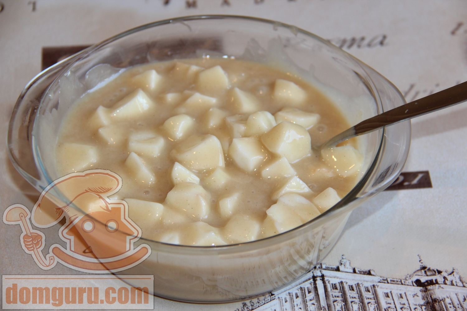 Яблоки нарежьте кусочками, добавьте к тесту и перемешайте так, чтобы яблоки были полностью покрыты им.