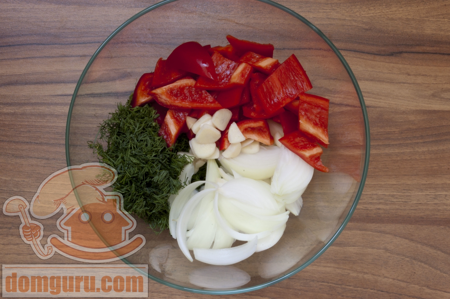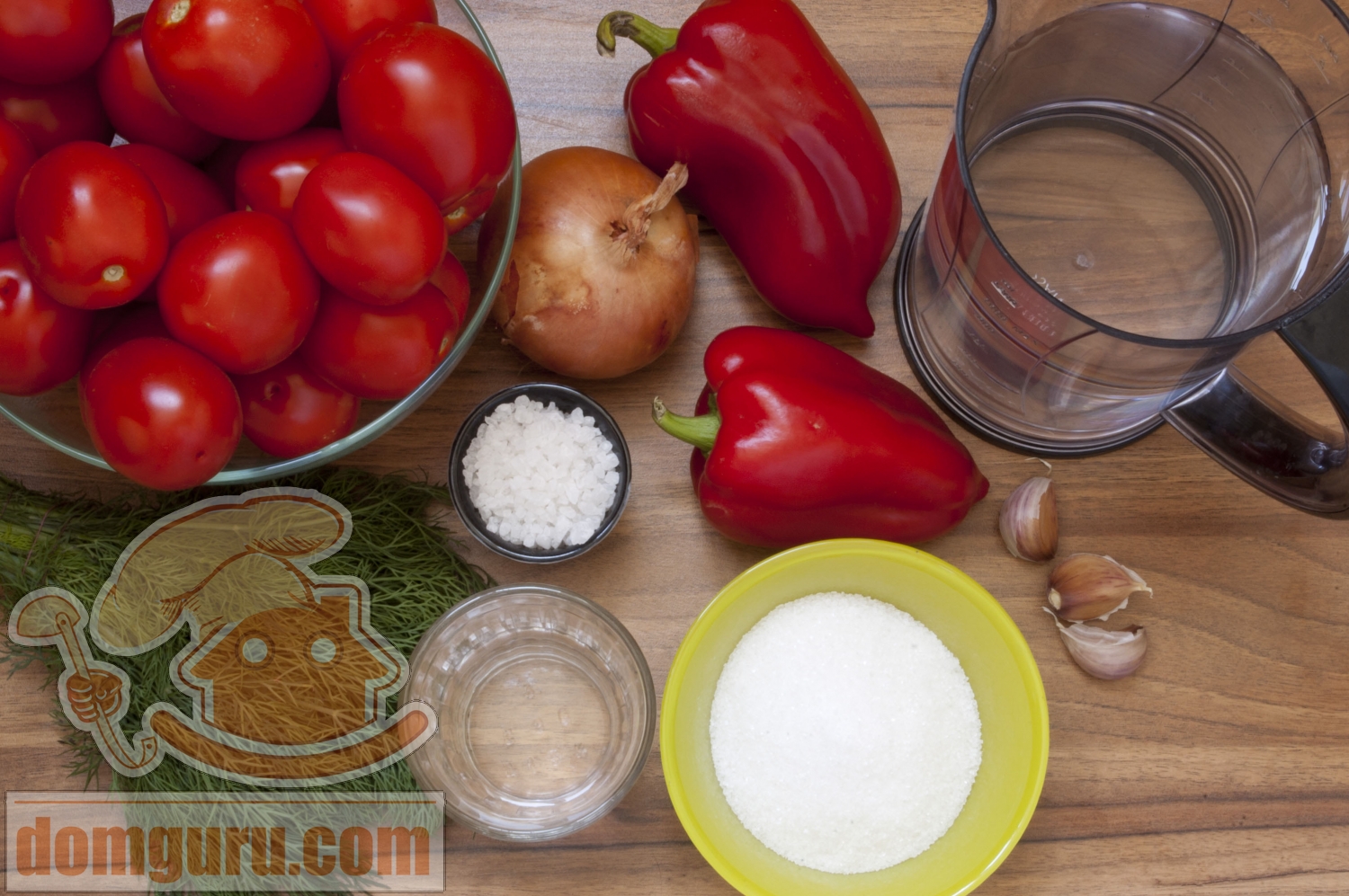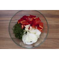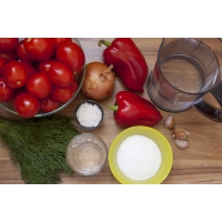 Подготовьте плотные, но спелые помидоры, сладкий красный перец, репчатый лук, чеснок, свежий укроп. Для маринада потребуются вода, сахар, соль и уксус - эти продукты необходимо соединить в кастрюле, довести до кипения (помешивая, чтобы сахар и соль растворились) и остудить до комнатной температуры.
