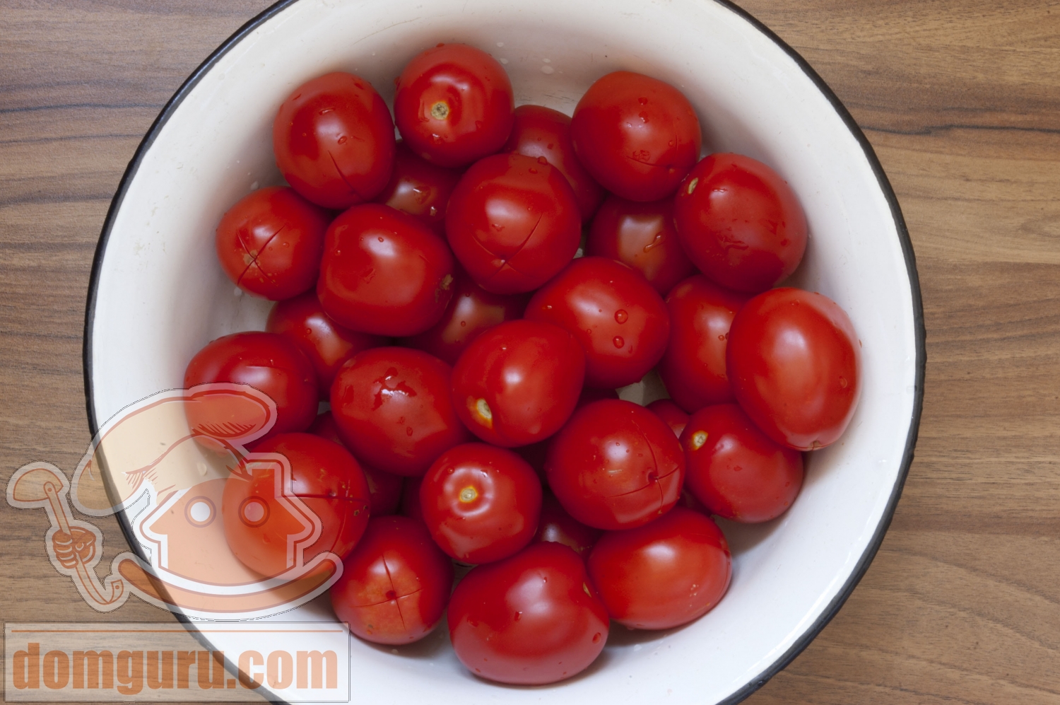 Помидоры промойте, сделайте крестообразный надрез на кончике. Залейте кипятком на минуту. Воду слейте. Помидоры остудите.