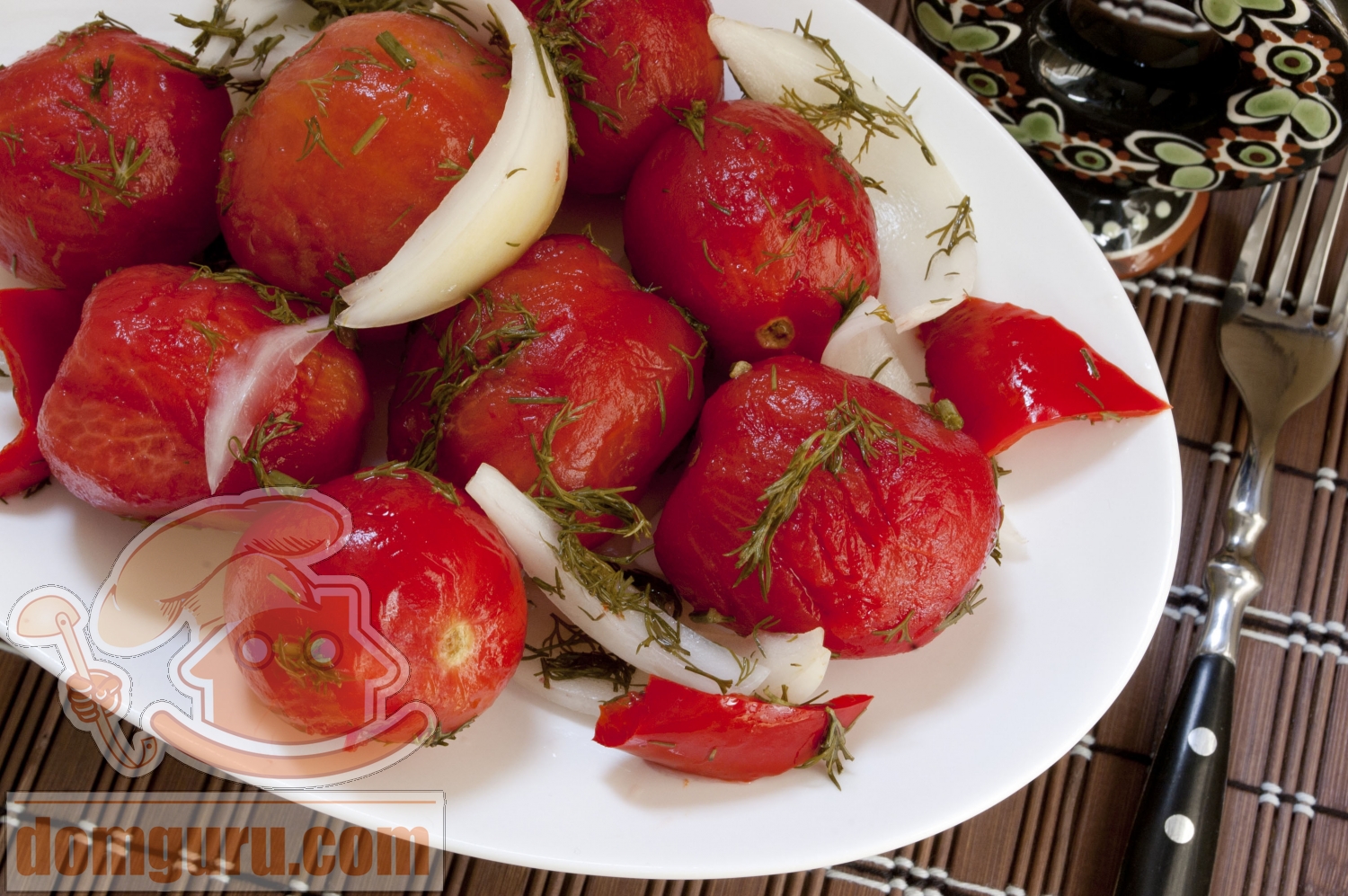 Приготовьте смесь из измельченных укропа, чеснока, сладкого перца (нарежьте его полосками или кусочками побольше), лука (полукольцами или "лепестками", дольками). Перемешайте. Сложите помидоры и подготовленную смесь слоями в трехлитровую банку или в другую емкость. Залейте остывшим маринадом и поставьте в холодильник на сутки.