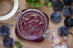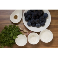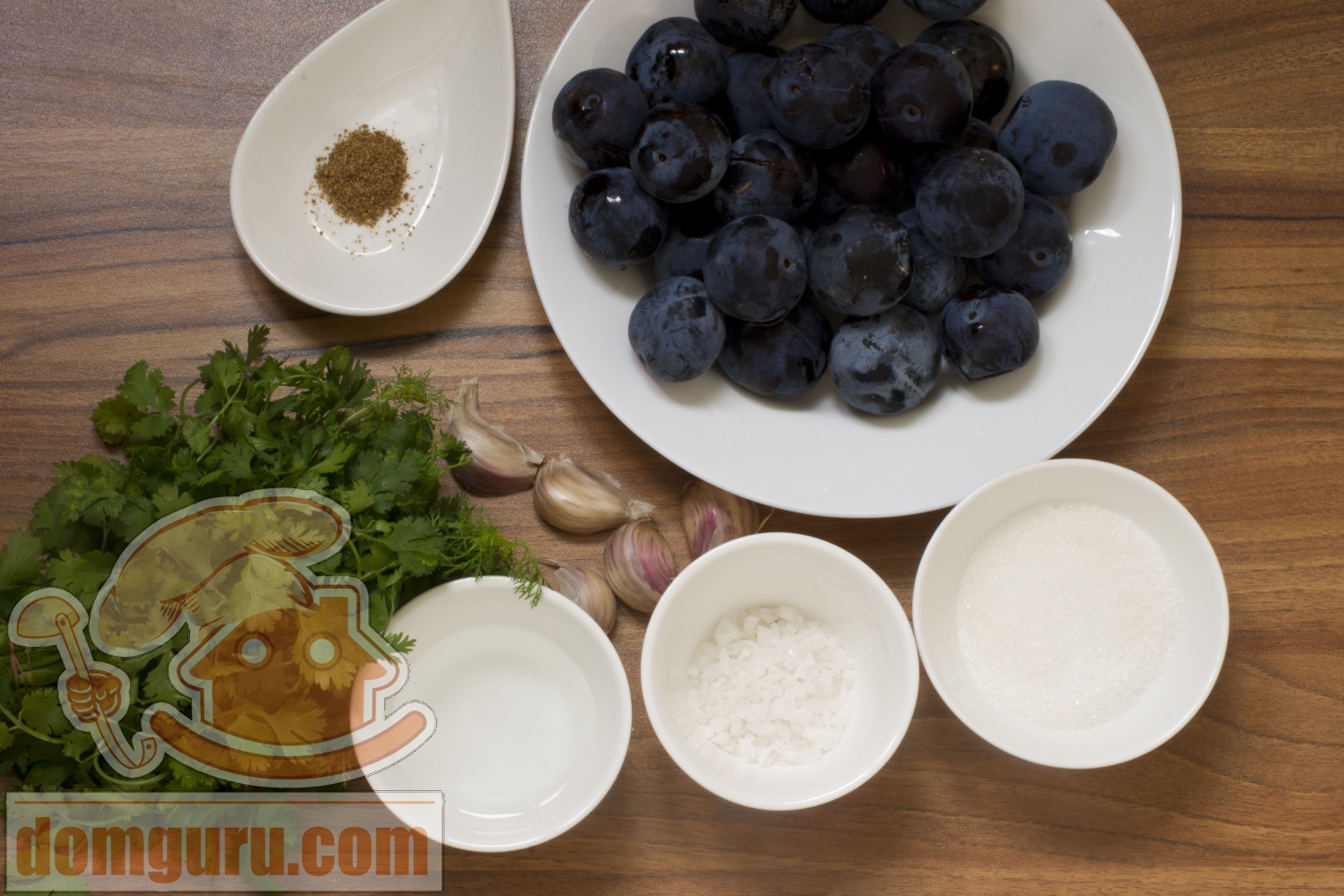 Подготовьте сливы, чеснок, свежую кинзу и необходимые пряности и специи.