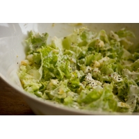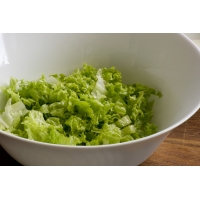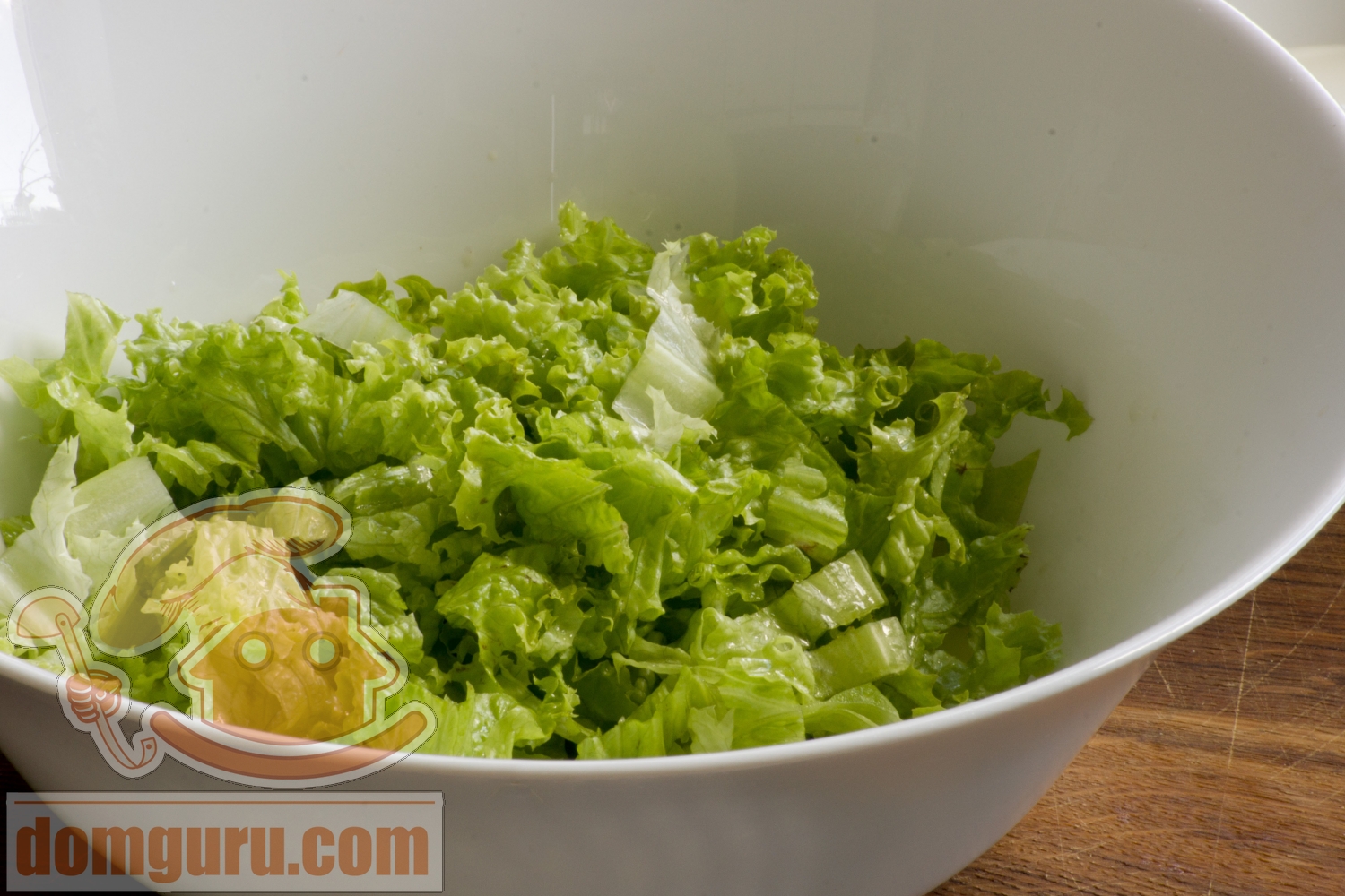 Листья салата промойте, отряхните, мелко нарежьте. Поместите в глубокую миску.