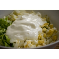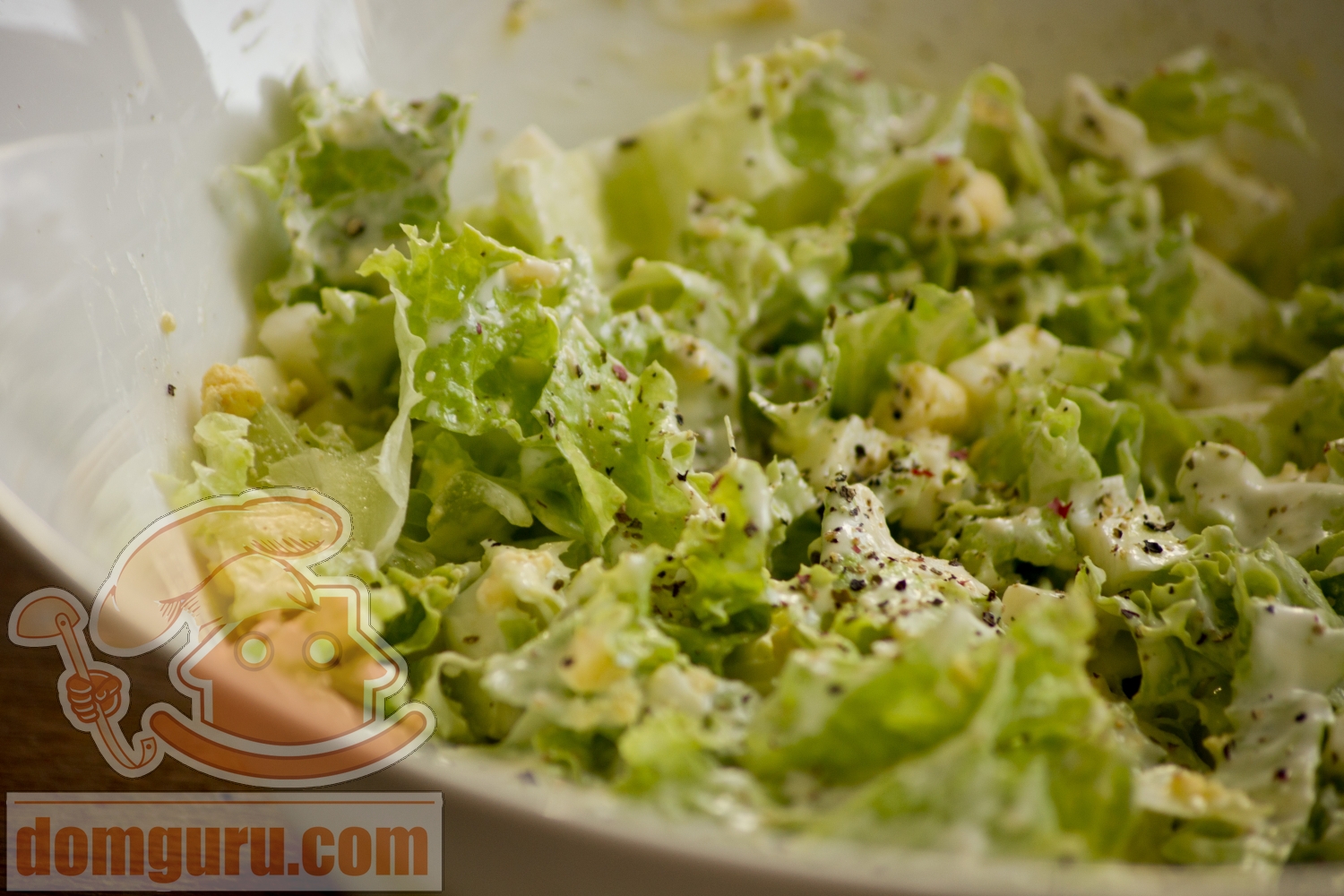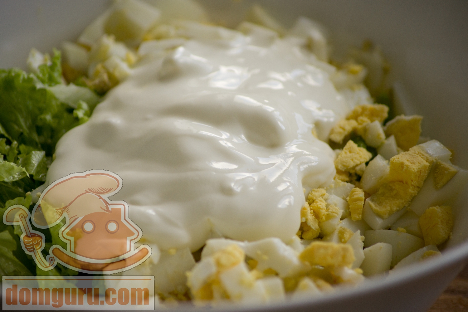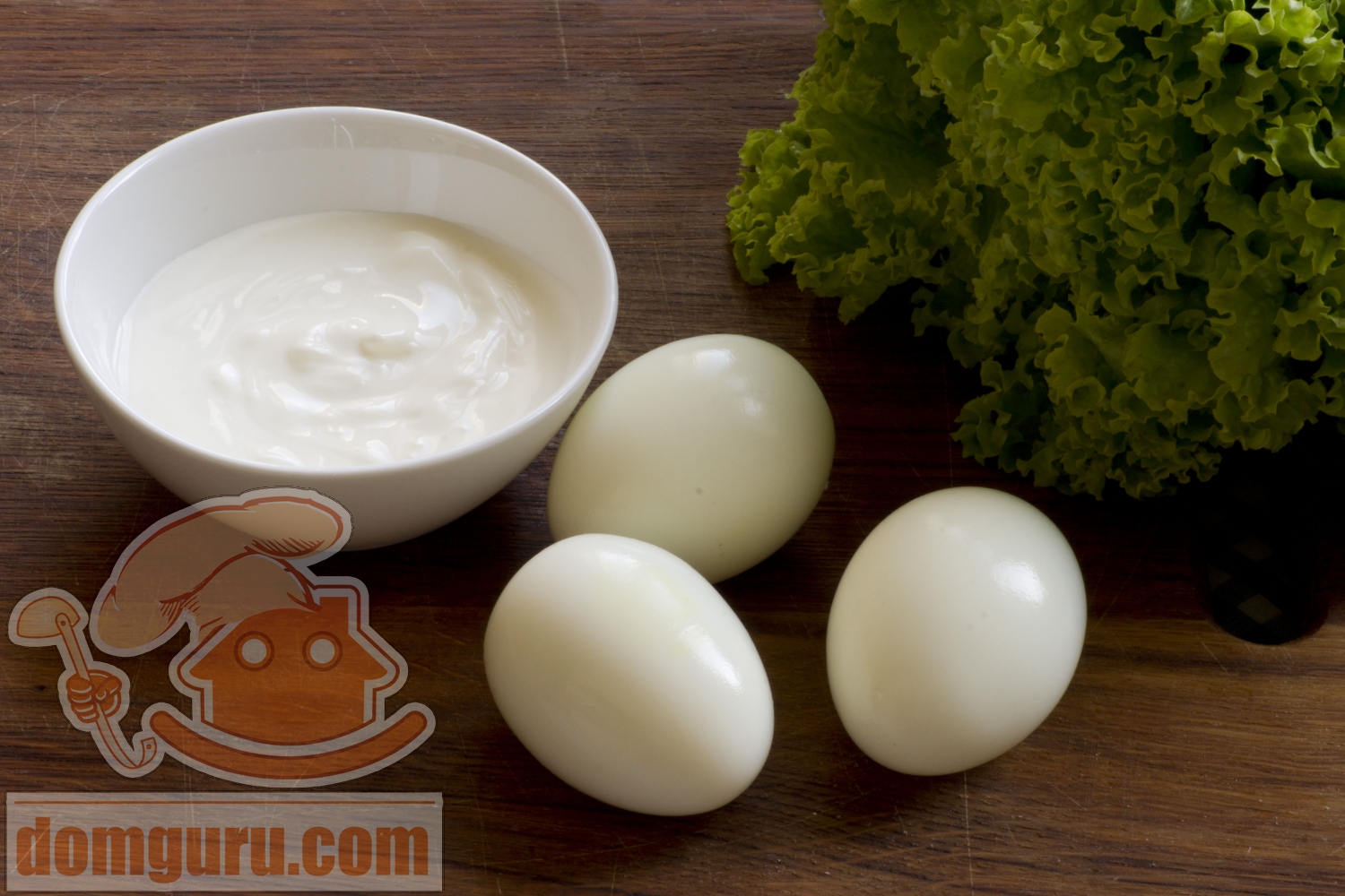 Подготовьте главные ингредиенты: отварные яйца (их надо остудить и почистить), салатные листья, сметану.