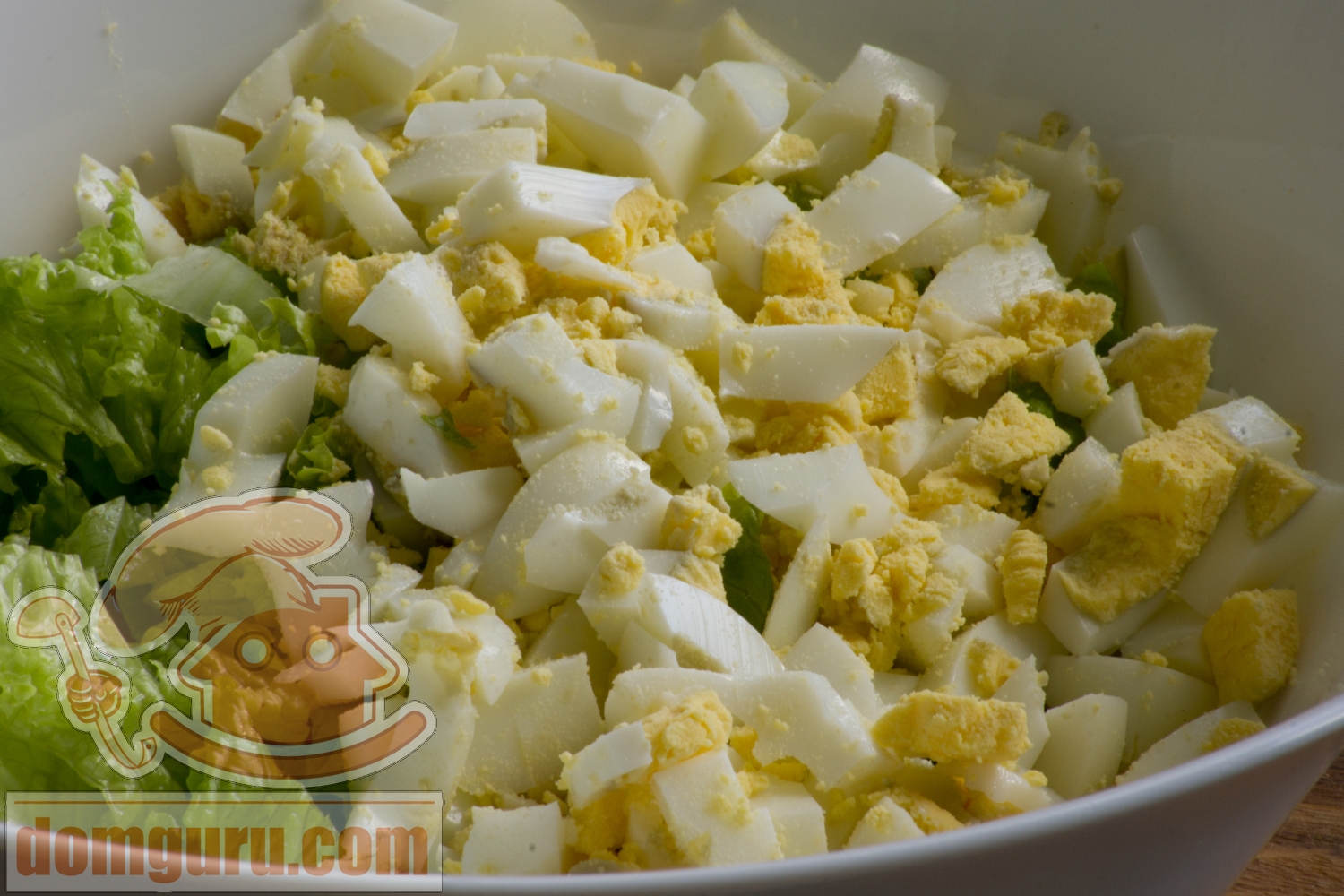 Нарежьте яйца мелкими кубиками и добавьте в салат.