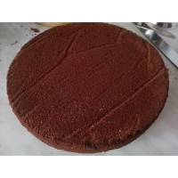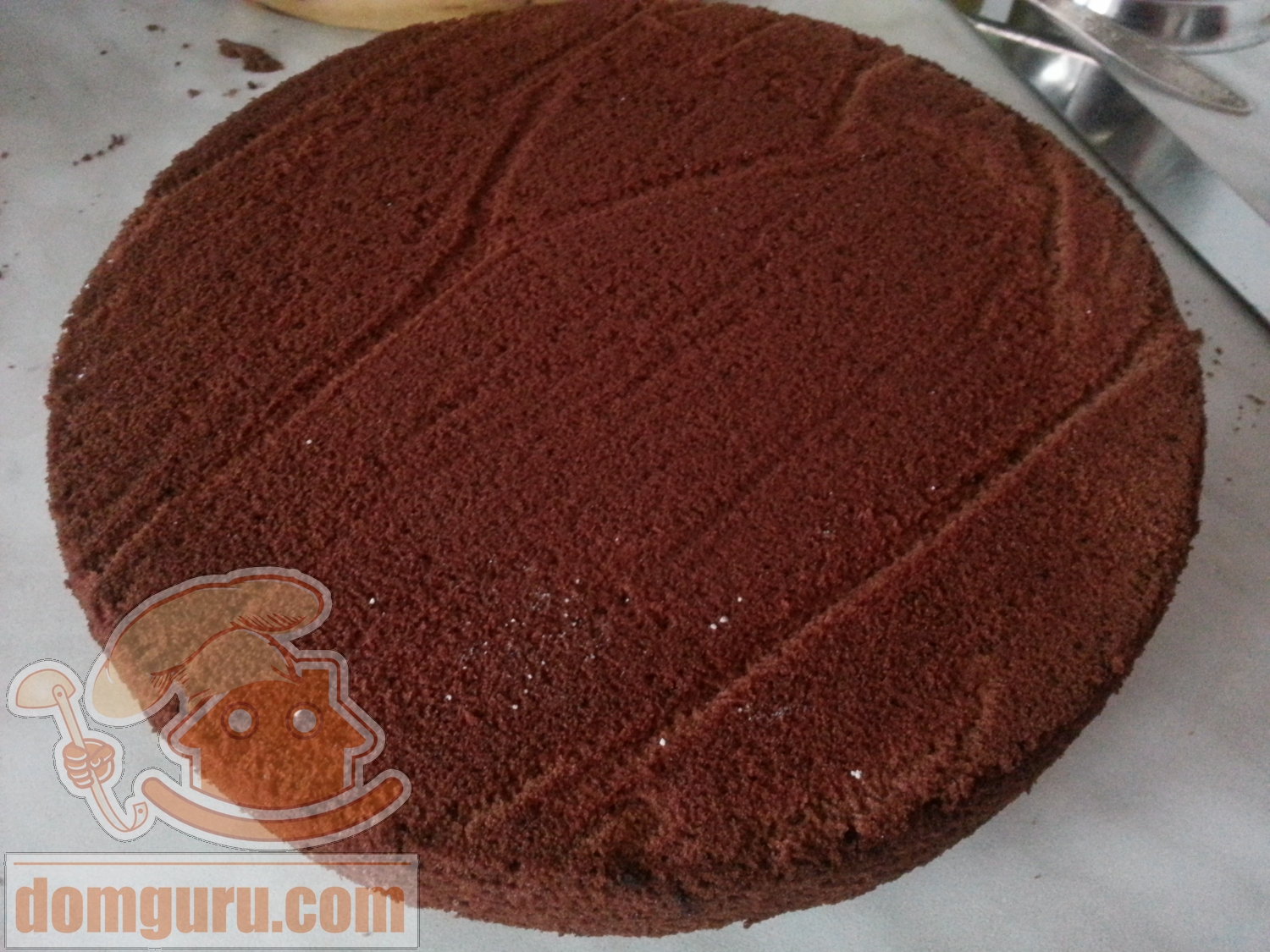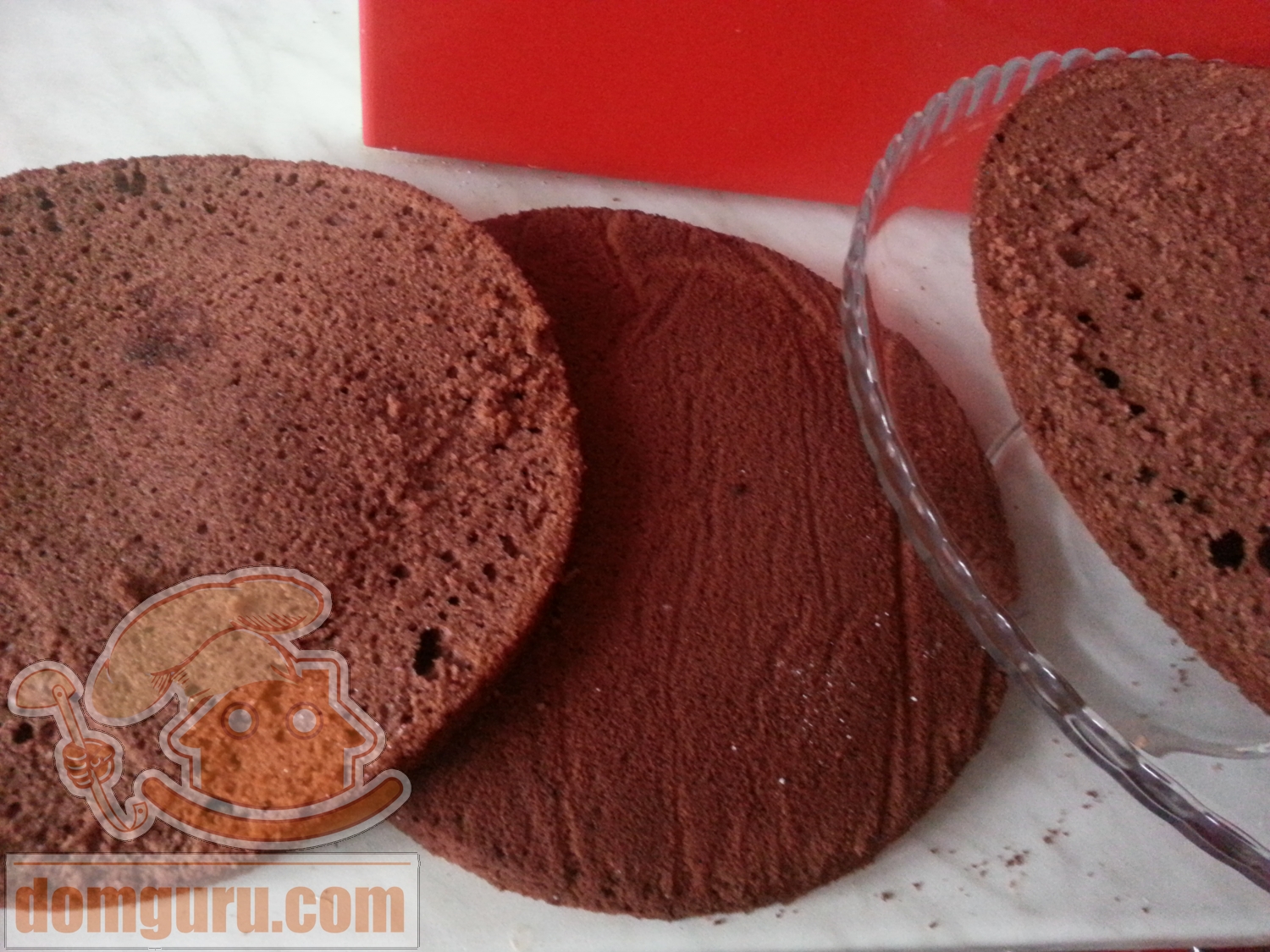 Разделите крем на 3 части, одной частью намажьте нижний корж ровным слоем при помощи лопатки.Возьмите немного вишни и разложите её поверх взбитых сливок. Накройте вторым коржом и намажьте его второй частью крема. Сверху положите еще один корж.
