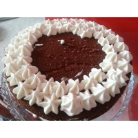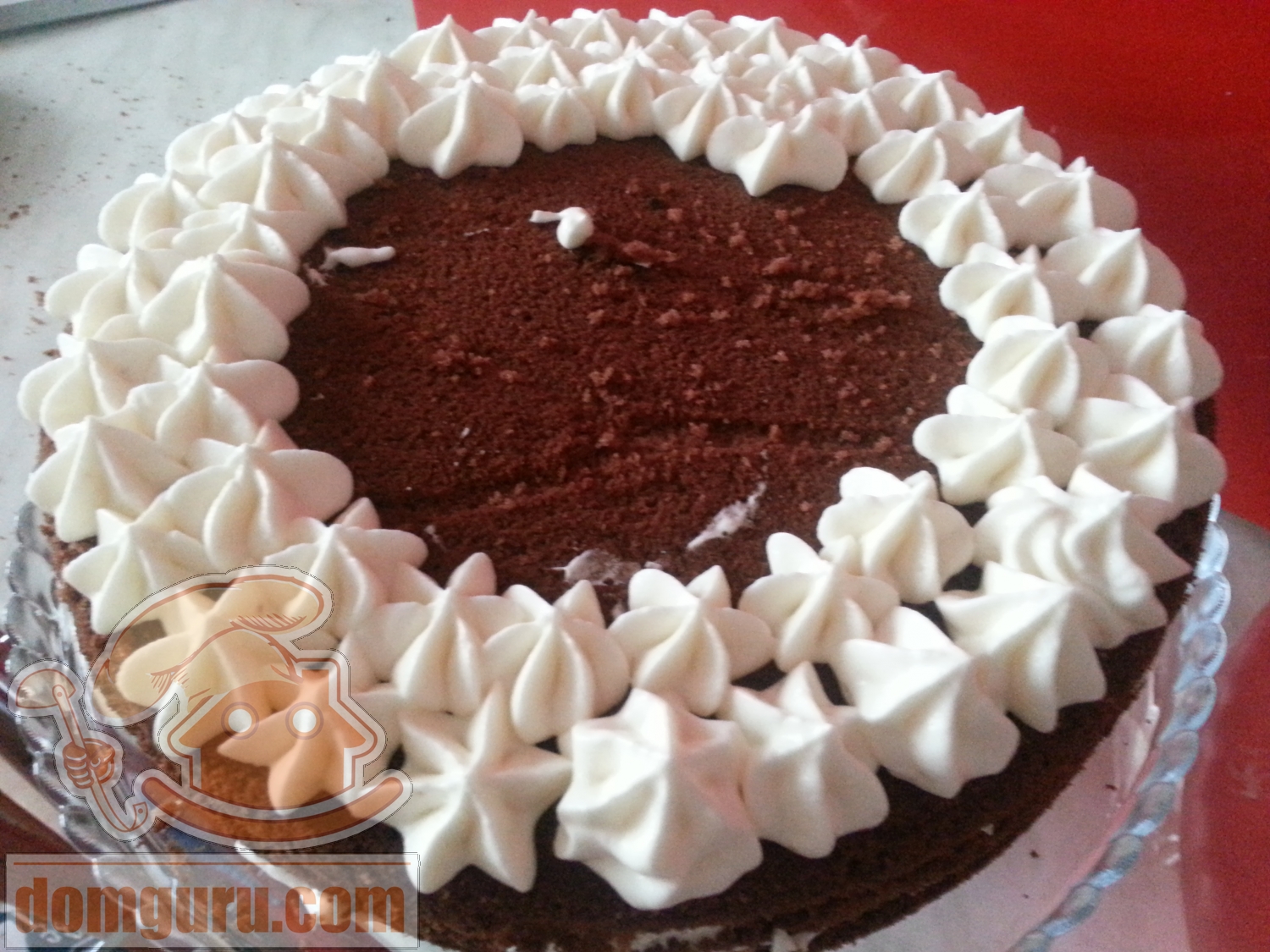 Последнюю часть взбитых сливок положите в кондитерский мешок с насадкой-звездочкой, и осторожно нажимая, покройте верхний корж торта завитками из сливок, двигаясь по кругу.