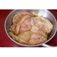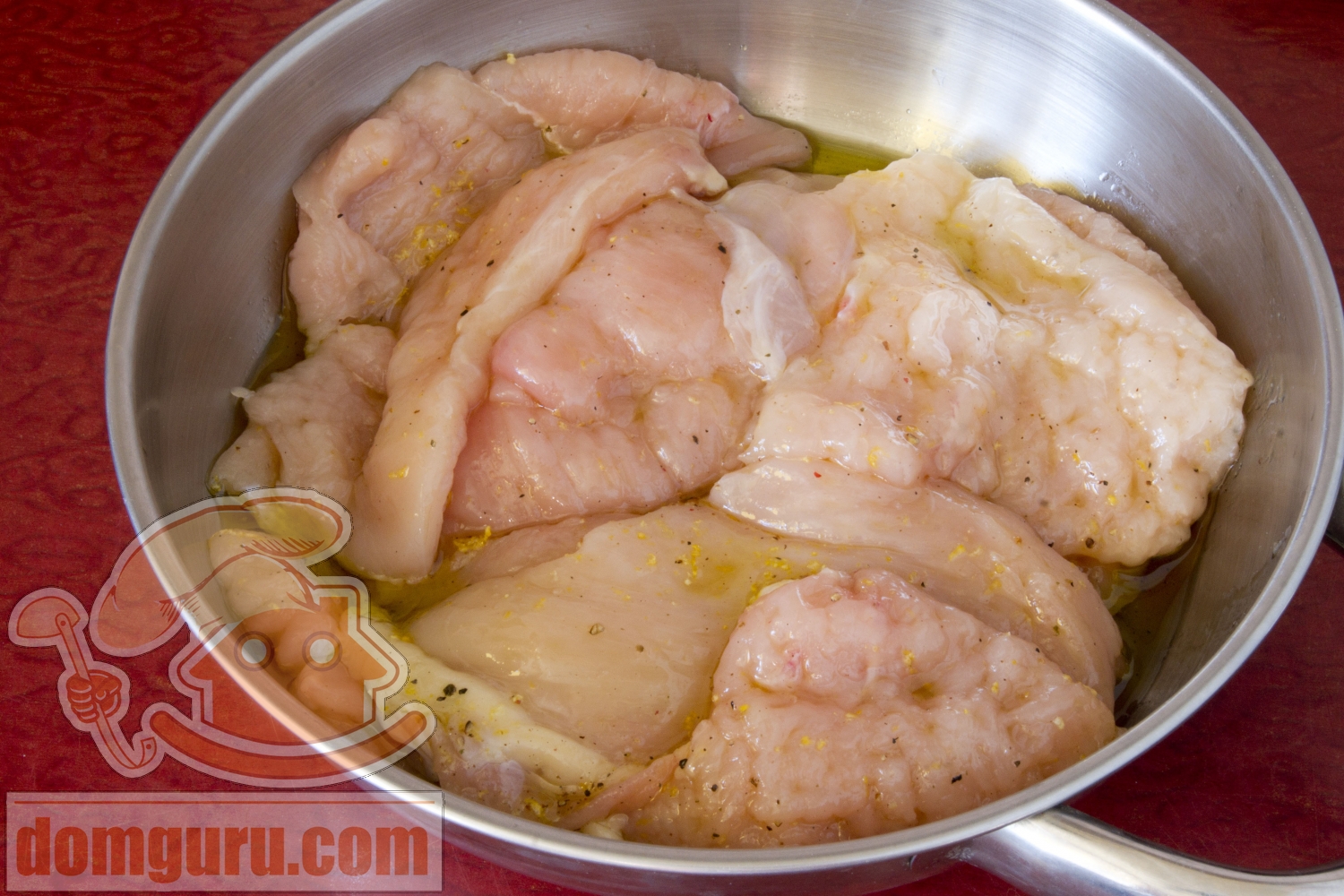 Мясо нужно разрезать на небольшие плоские ломтики, отбить через пакет и замариновать на 15-30 минут в смеси оливкового масла, лимонной цедры, соли и перца.