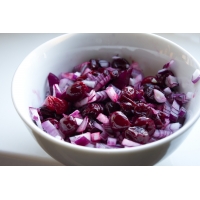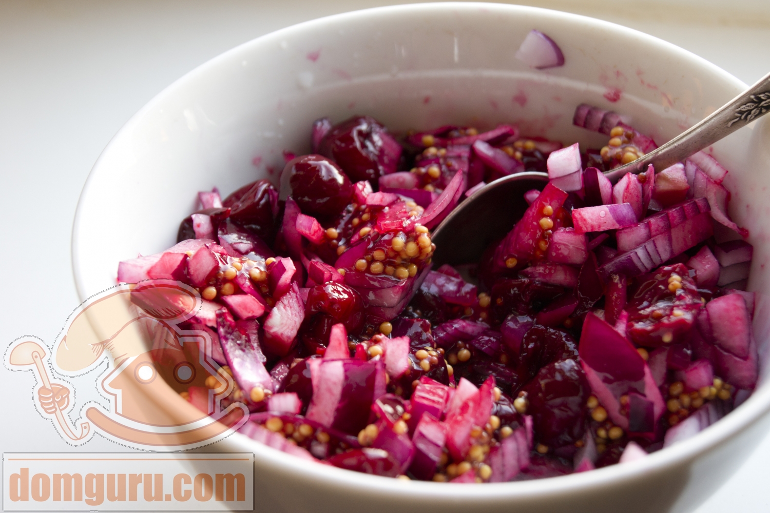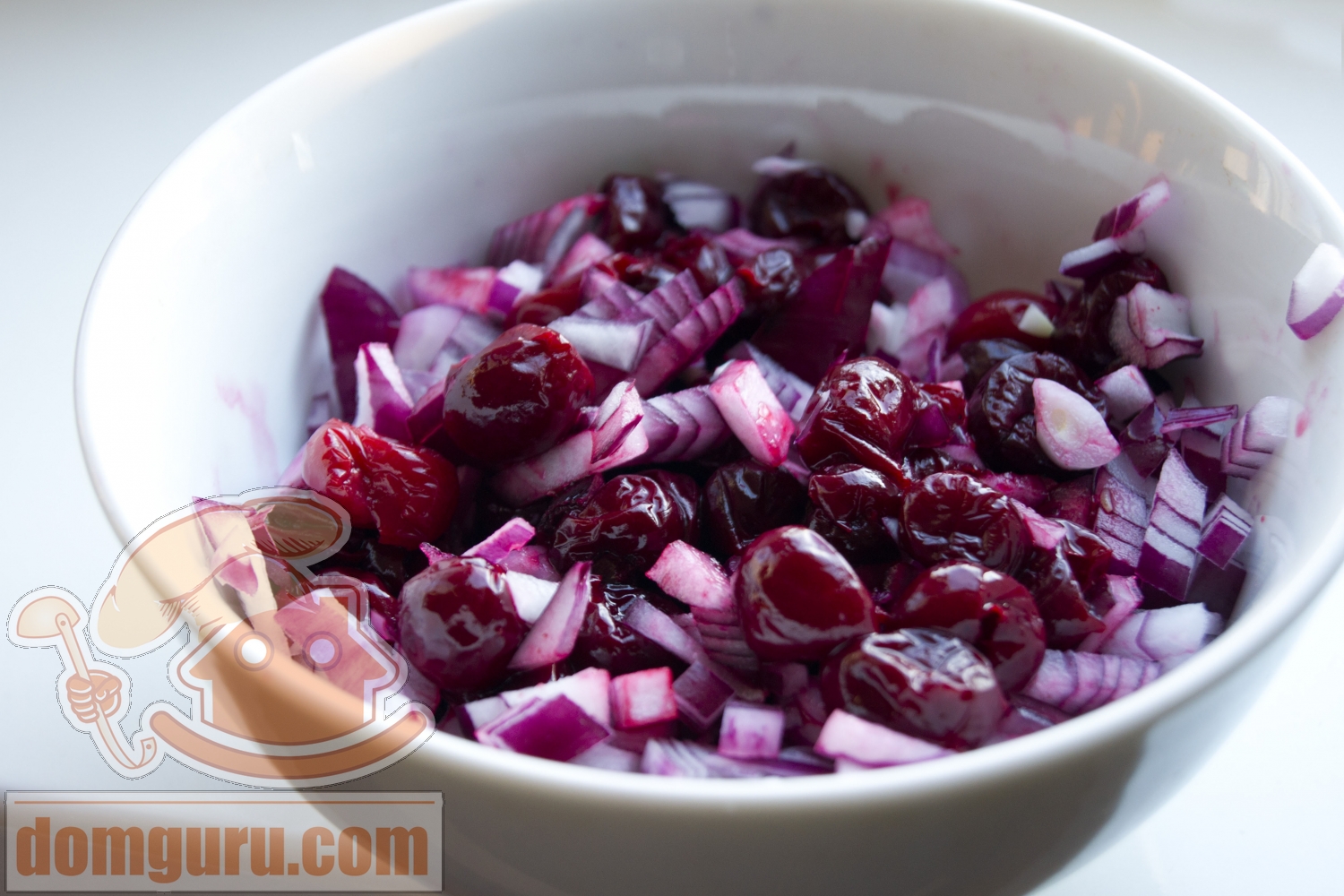 Лук почистите, мелко нарежьте, соедините с вишней.