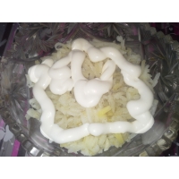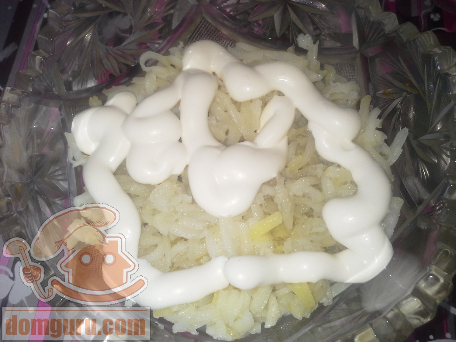 Натрите картофель на крупной терке, уложите его в салатницу ровным слоем и залейте майонезом.