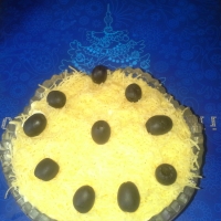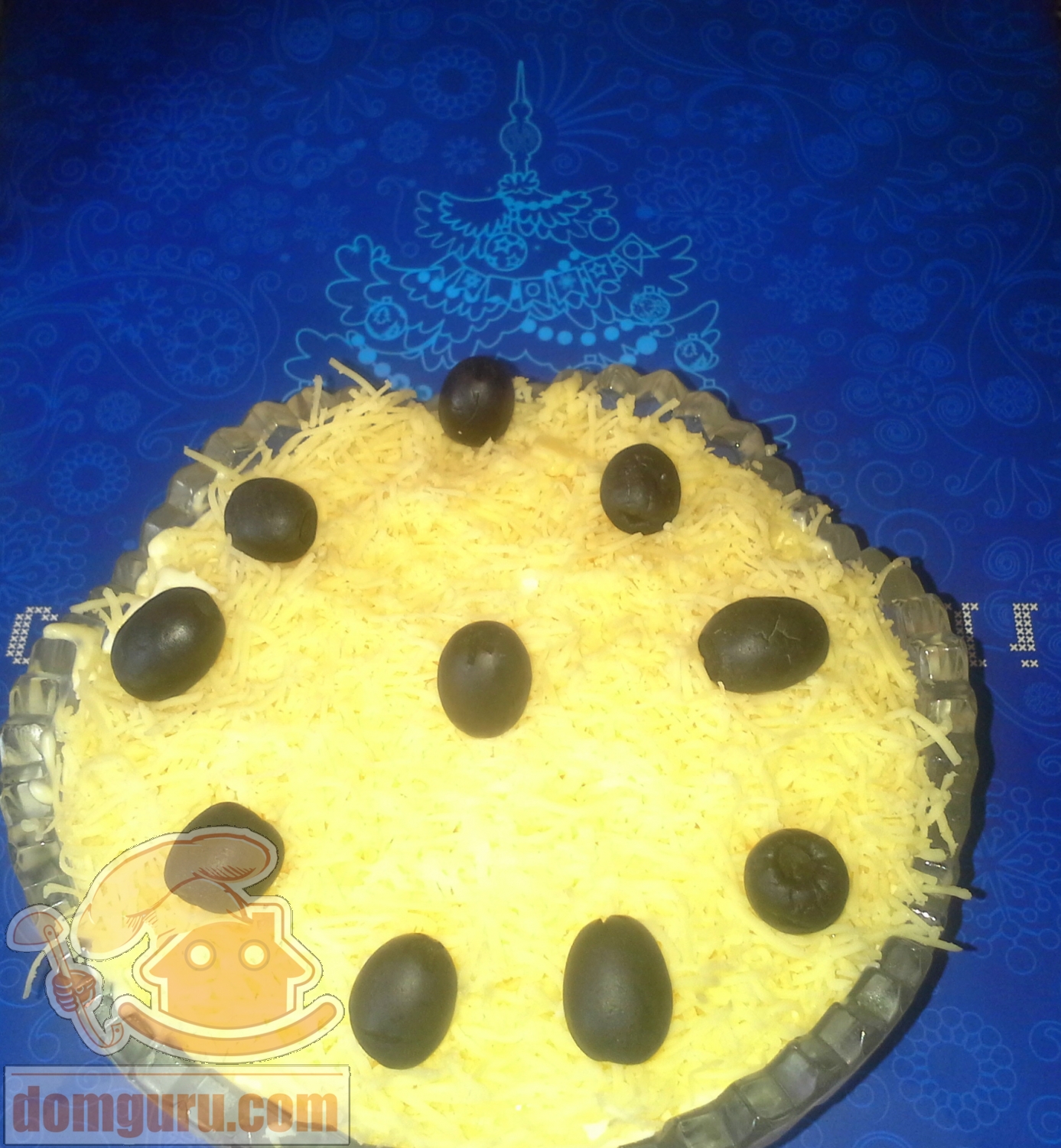 Сверху натрите сыр на мелкой тёрке и украсьте маслинами. Приятного аппетита!