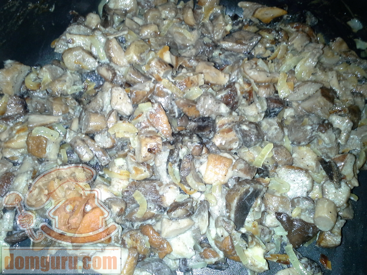 Поджарьте грибы на сливочном масле с мелко нарезанным репчатым луком, не забудьте посолить и поперчить, в конце добавьте пару ложек сметаны.