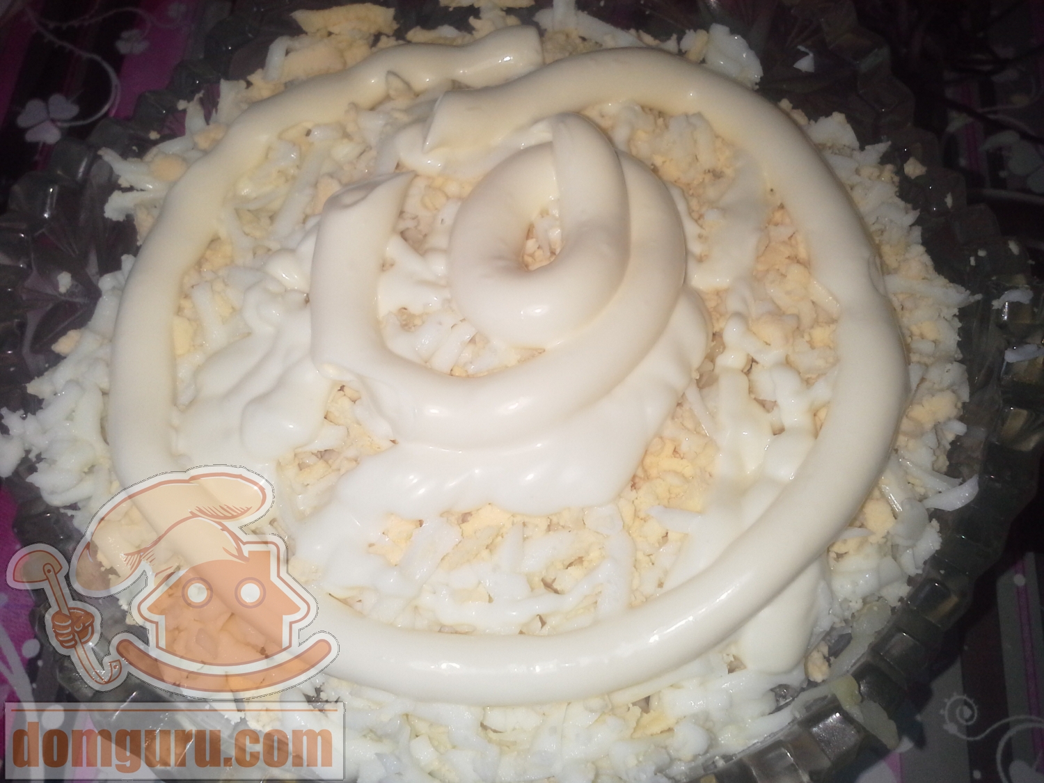 Следующим слоем идет яйцо на крупной терке и слой майонеза.
