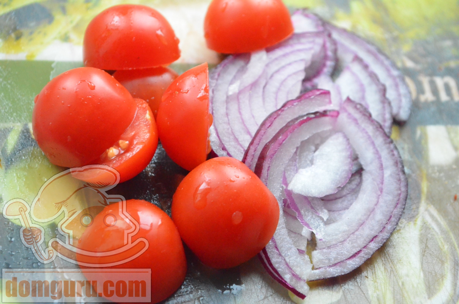 Лук нарежьте полукольцами, добавьте сок половины лайма (лимона), соль и сахар по вкусу, всё перемешайте. Маринуйте в течение 15 минут. Томаты черри порежьте пополам. Приготовьте соус: выдавите сок лайма, добавьте 3 столовые ложки оливкового масла, 2 чайные ложки зернистой горчицы, соль и сахар по вкусу. Перемешайте. Дайте настояться 15 минут.