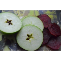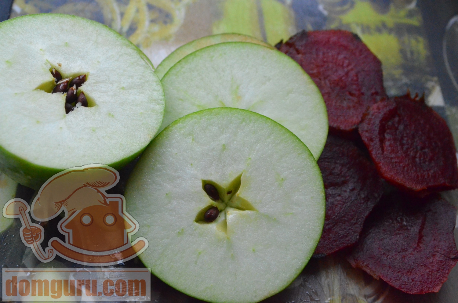 Отварите свеклу до готовности и нарежьте кружочками толщиной 0,5 см. Также нарежьте на кружочки такой же толщины яблоки. При помощи специальной формы или стакана придайте кружочкам ровную форму. Аналогично вырезать кружок из яблока. Подготовленный кружок из яблока сбрызнуть лимонным соком (чтобы не потемнело).