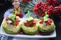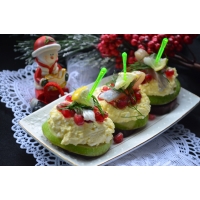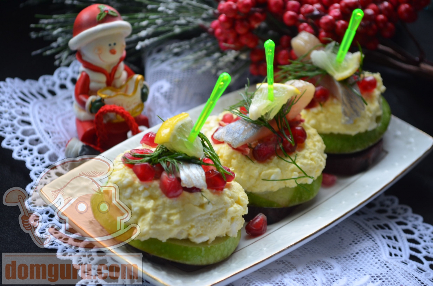 На кружочек свеклы выложите кружок из яблока, сверху при помощи формы (если нет специальной, можно сделать из фольги) выложите смесь взбитую блендером. Поверх выложите филе сельди, предварительно порезав на небольшие кусочки. Украсьте блюдо лимоном, зернами граната и свежим укропом.