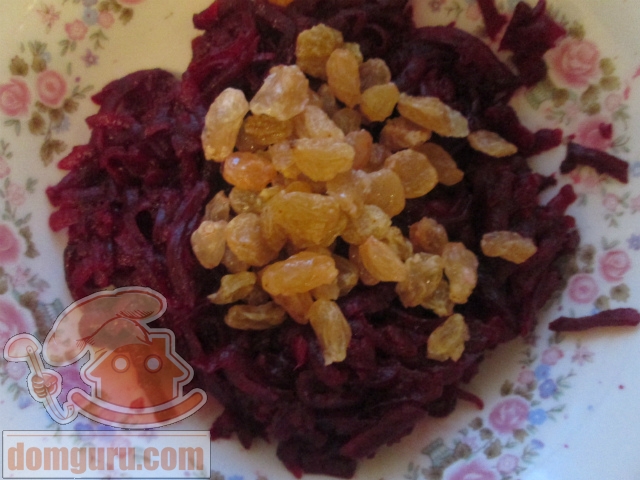 Отваренную свеклу натрите на средней терке, добавьте вымытый изюм.