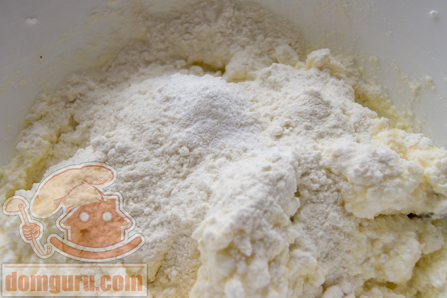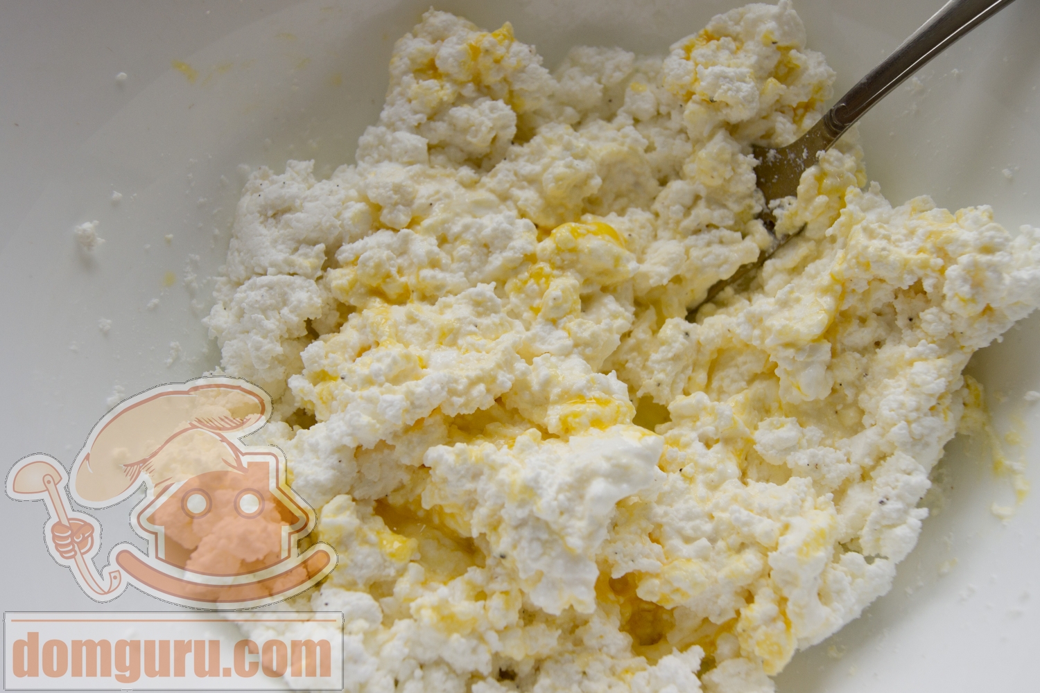 Добавьте яйцо. Перемешайте, добавьте 3-4 ст.л. муки с разрыхлителем. Добавляйте понемногу. Масса должна стать плотноватой, но мягкой, не разваливаться, но и не липнуть сильно к рукам. В зависимости от влажности творога муки может уйти чуть больше или меньше.