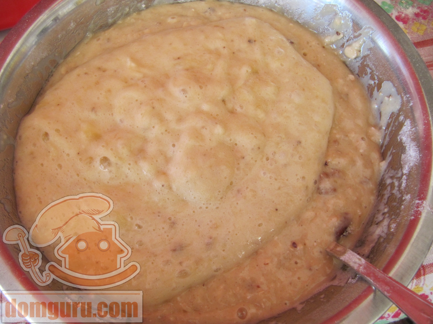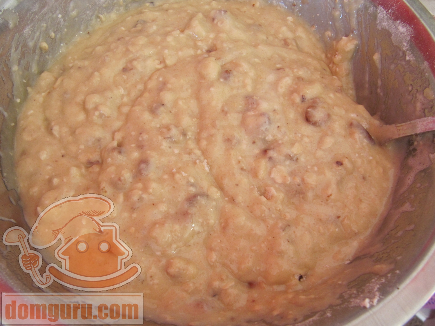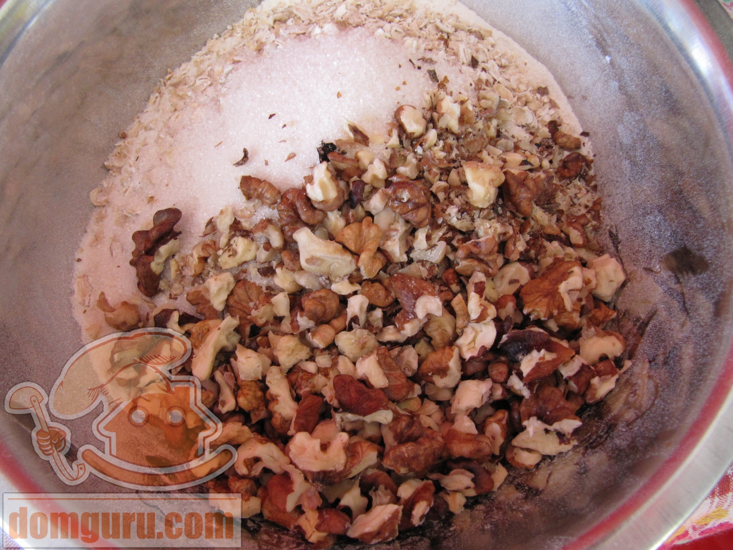 Всыпьте овсяные хлопья, сахар, ванилин, орехи.