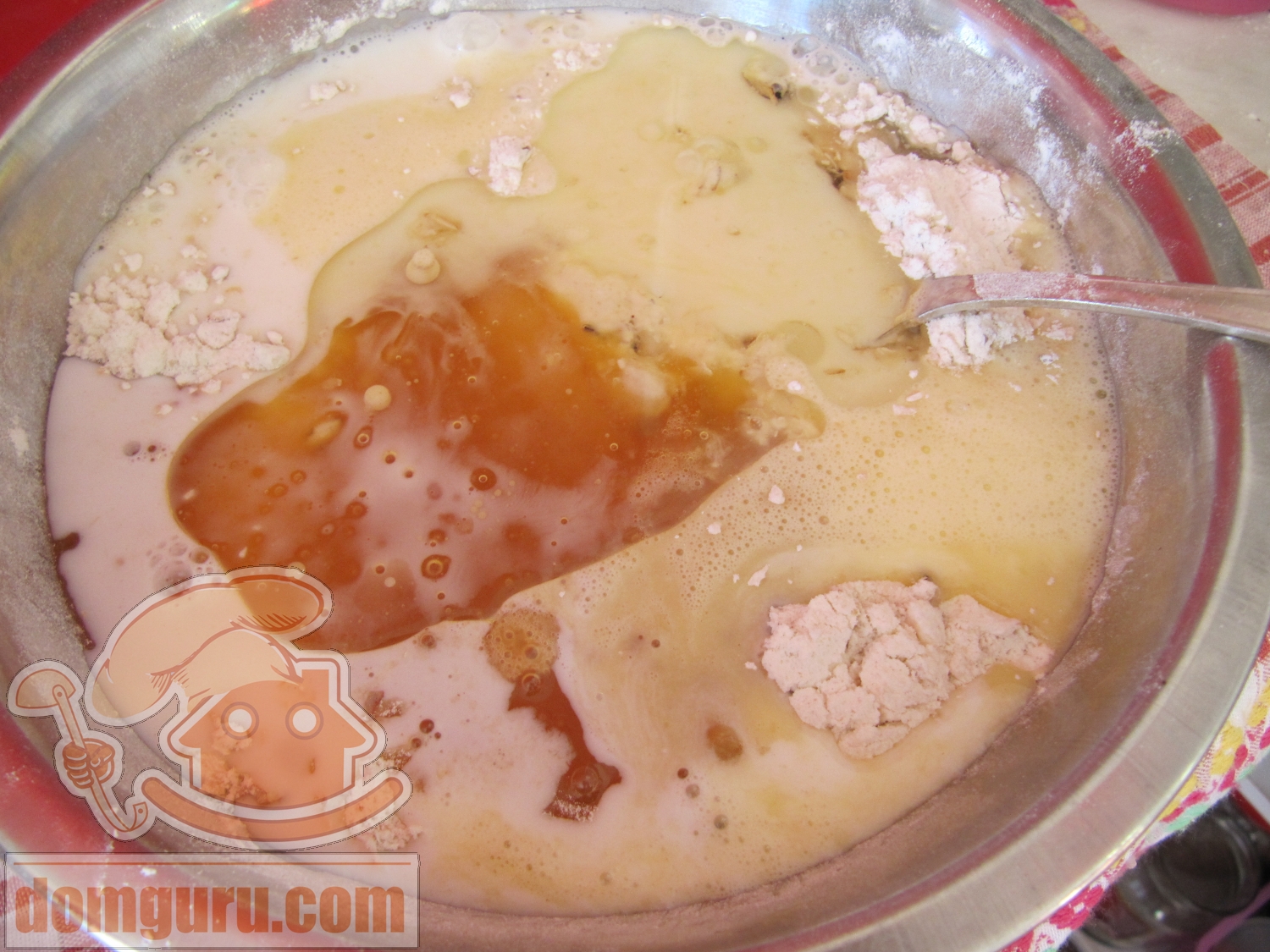 Добавьте к сухим ингредиентам взбитые яйца, мёд, молоко.