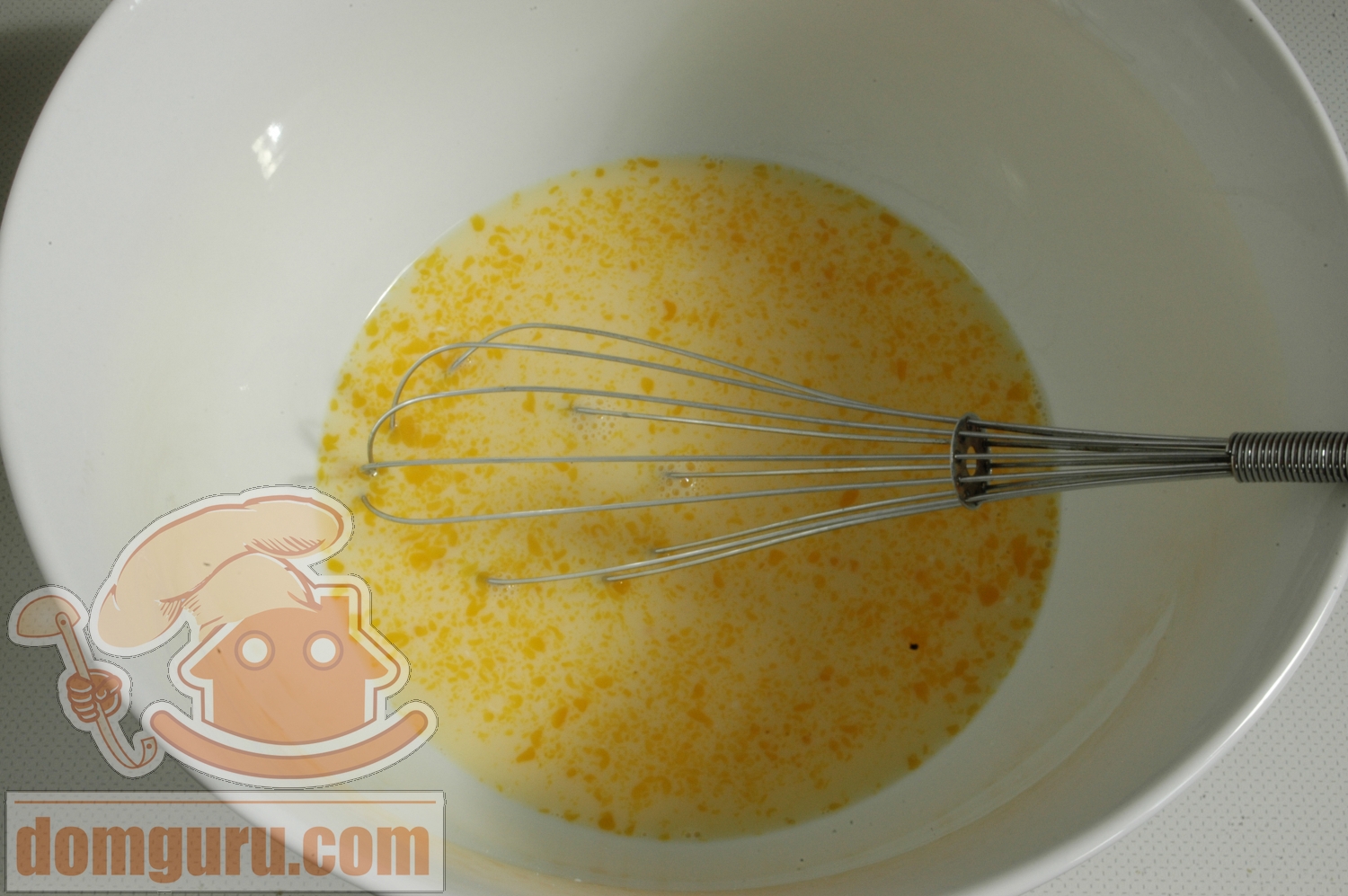 Взбейте в большой миске желтки с щепоткой соли, влейте молоко. Взбейте желтки и щепотку соли в большой миске. Добавьте молоко.