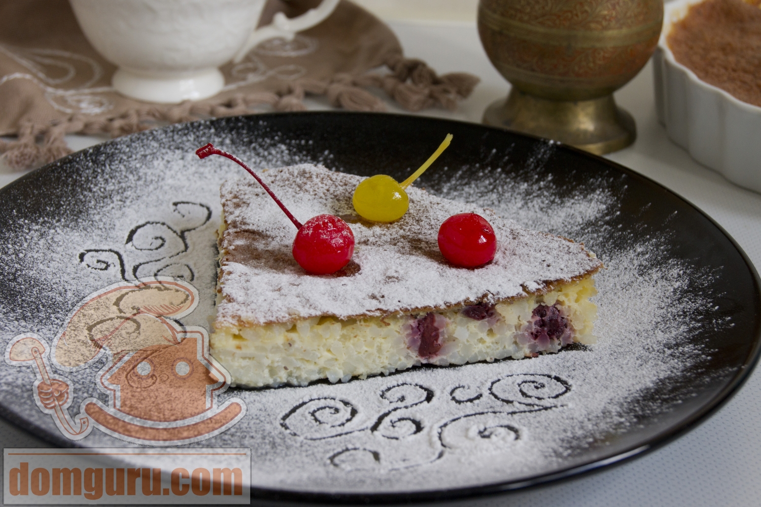 Посыпьте готовый пирог сахарной пудрой, украсьте коктейльными вишнями.
