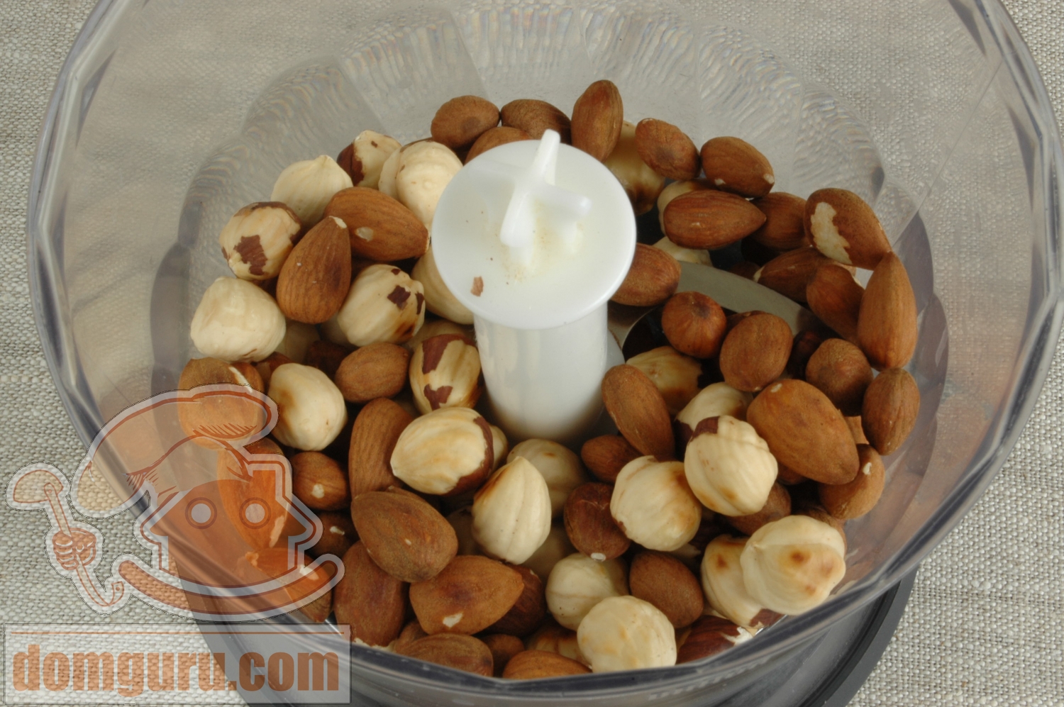 Обжарьте фундук на сухой сковородке, удалите шелуху. Вместе с миндалем измельчите в блендере.