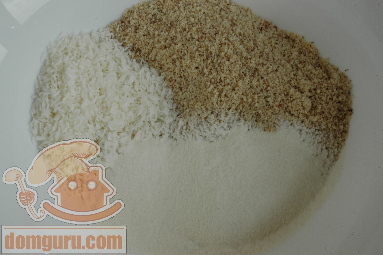 Соедините орехи с кокосовой стружкой, ванильным сахаром, содой и просеянной мукой.