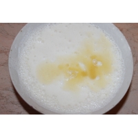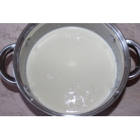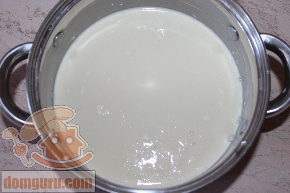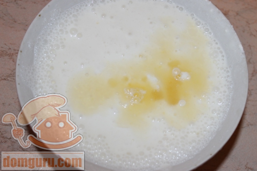 Добавьте молоко, затем, постепенно всыпая муку, приготовьте жидкое блинное тесто. В конце добавьте в тесто растительное масло.