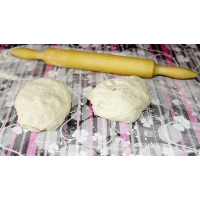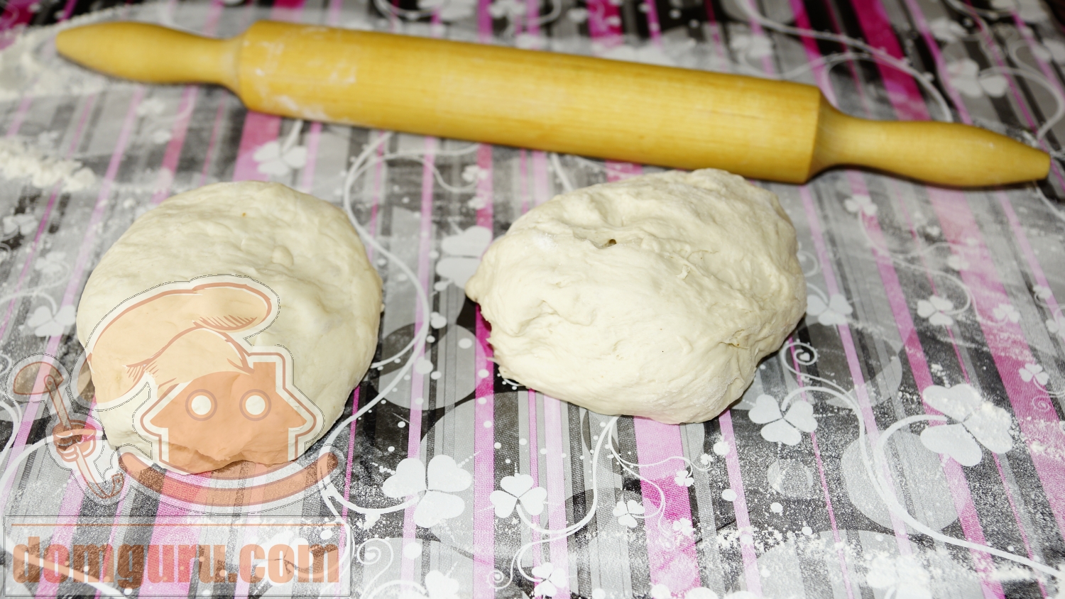 Когда тесто станет достаточно крутым, начинайте месить его руками. Получившееся тесто разделите на 2 части, если вы будете печь пиццу диаметром около 25 см.