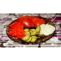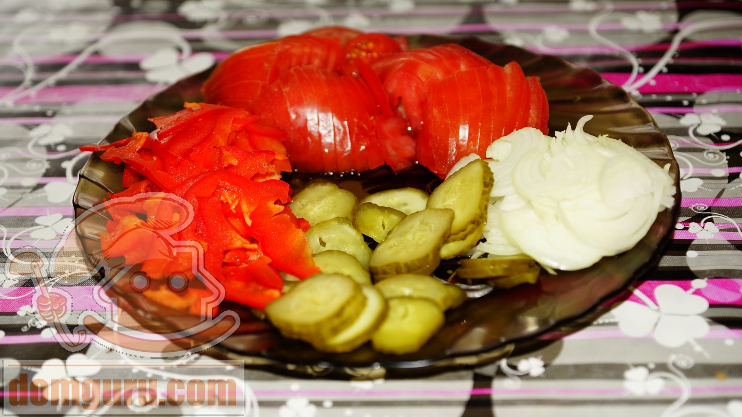 Нарежьте тоненько перец, помидоры и огурцы кружочками, лук полукольцами.
