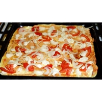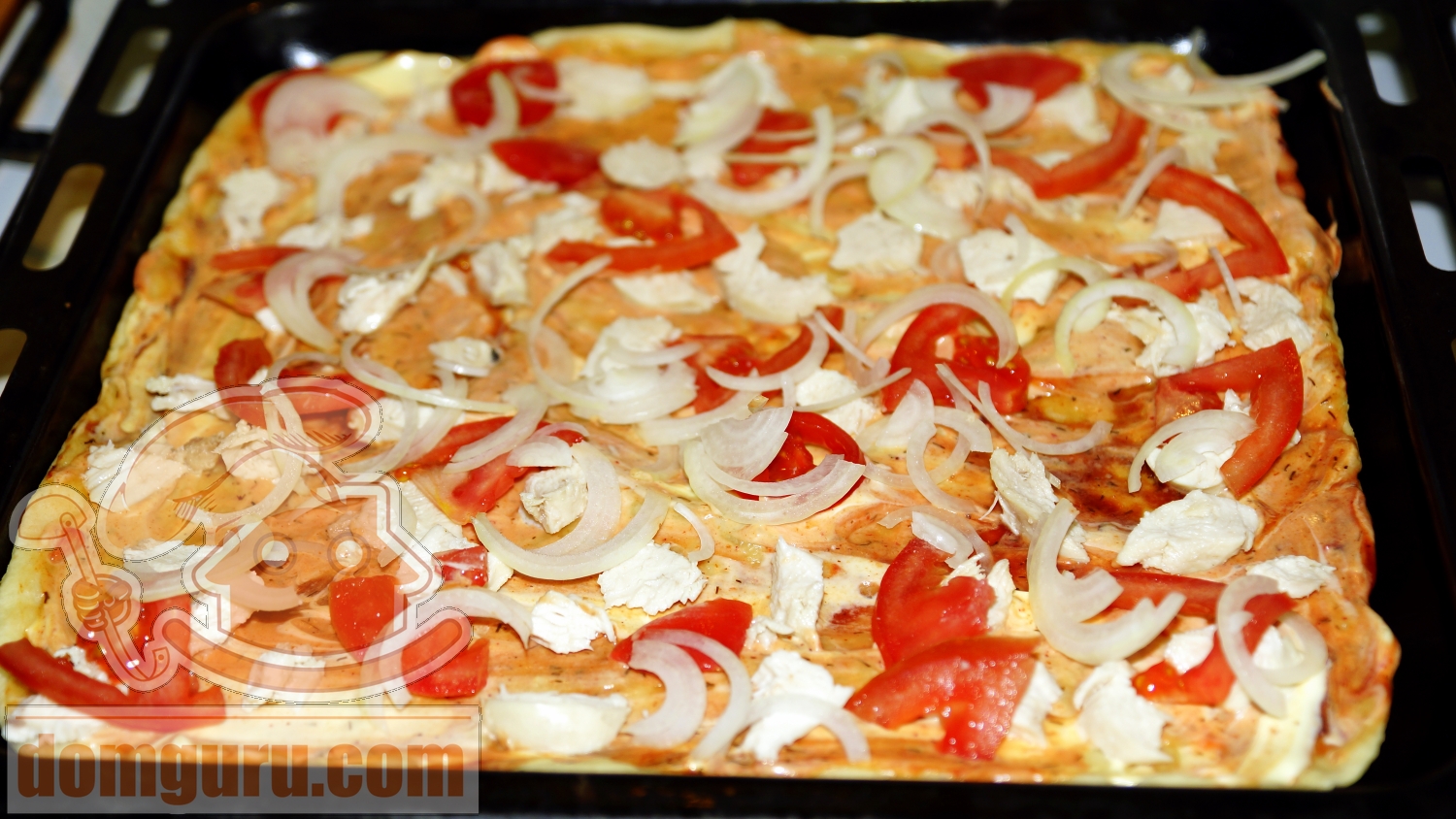 Выложите на тесто лук, курицу и помидоры и отправьте пиццу опять в духовку минут на 10.