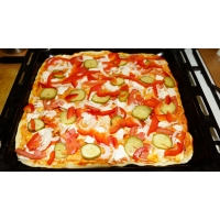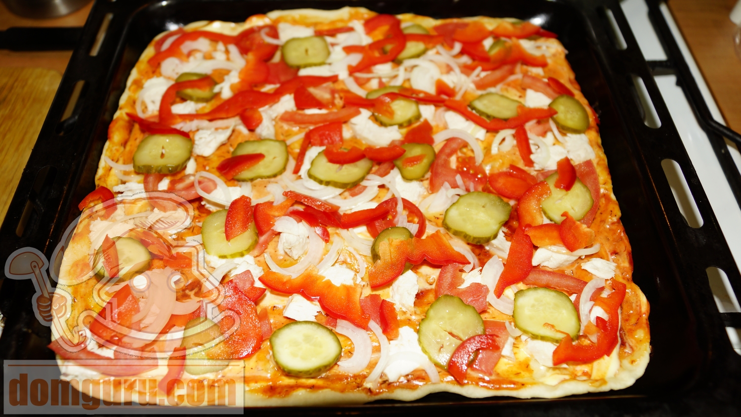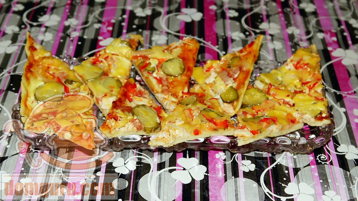 Раскатайте тесто по форме и намажьте его кетчупом и майонезом. Поставьте в духовку минут на 5-10, при температуре 200 градусов, пока будете резать остальную начинку.
