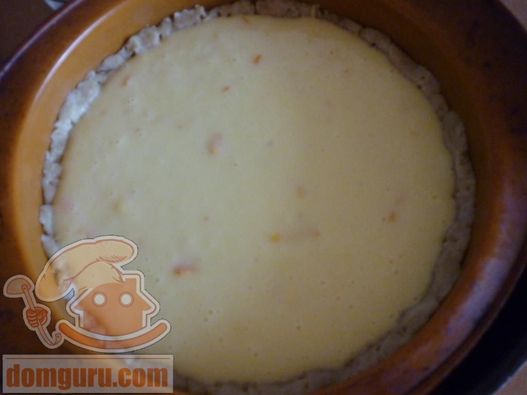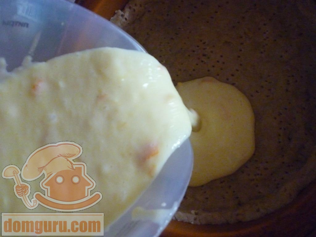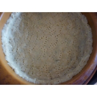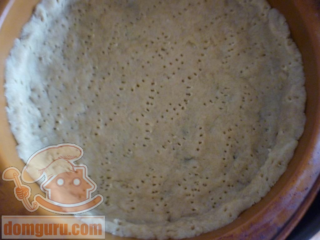 Тесто раскатайте и поместите в форму, образуя бортики высотой как минимум 1,5 см ( я сразу распределяла руками по форме). Наколите вилкой.