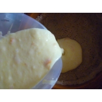 К апельсиновому пюре добавьте манную кашу, взбейте. К полученной массе добавьте оставшуюся манную крупу, оставшийся сахар, 1 яйцо и 40 г масла. Всё перемешайте и оставьте на 15-20 минут.