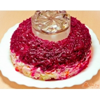 Среди традиционных праздничных блюд на наших столах особое место занимает удивительно красивый слоёный салат «Гранатовый Браслет». Собственно, его хочется назвать «салат-торт», так как яркие, блестящие и переливающиеся на свету гранатовые зёрна придают ему просто роскошный вид. Салат традиционно делают в форме кольца, поэтому он и получил своё название. Сделать блюдо такой формы совсем не сложно: просто поставьте в центр тарелки, на которую будете выкладывать салат, банку, бутылку или стакан.