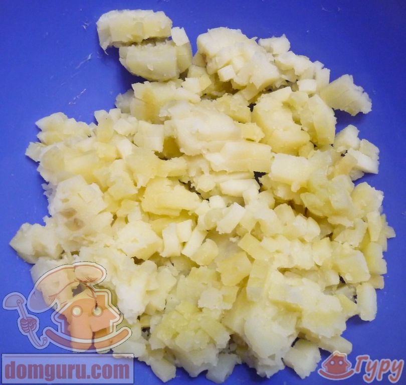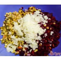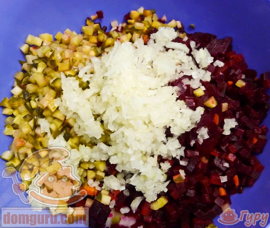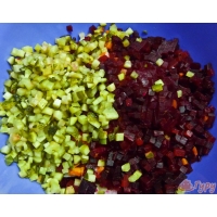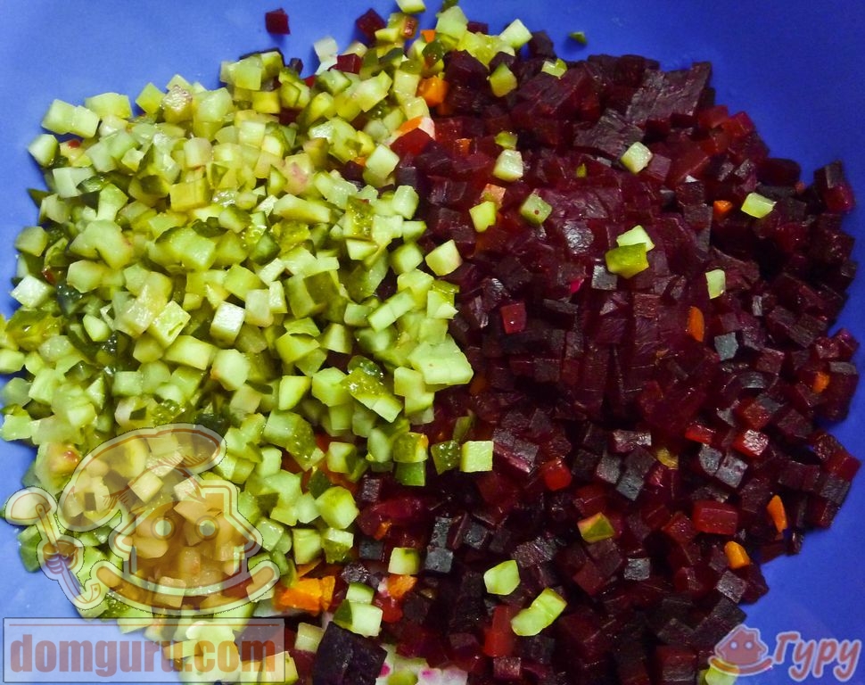 Затем нарежьте кубиками свеклу и солёные огурцы.