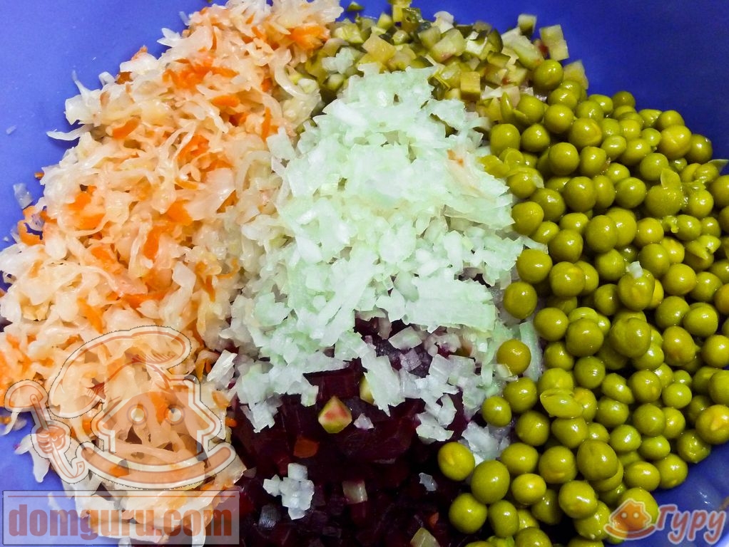Затем добавьте в салат квашеную капусту и по желанию зелёный консервированный горошек. Заправьте салат маслом, посолите и поперчите по вкусу.