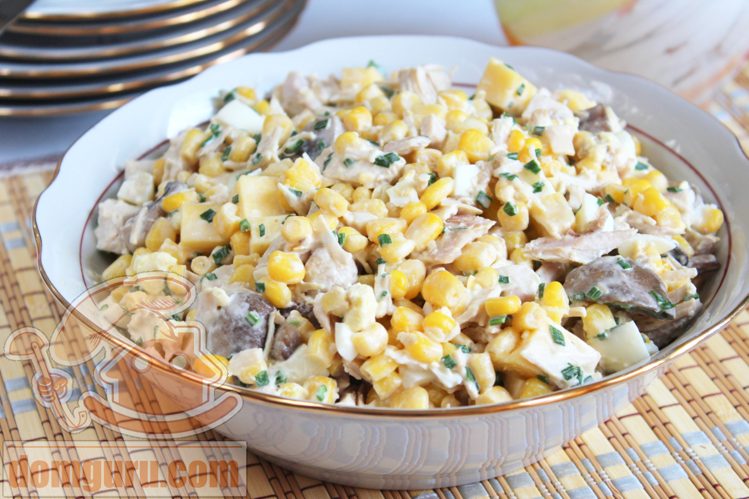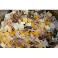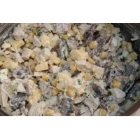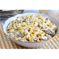 Зелёный лук мелко нарежьте. Все ингредиенты соедините, и добавьте кукурузу.