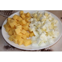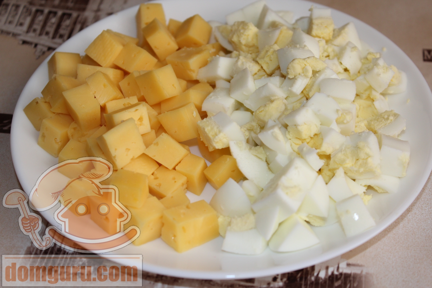 Для этого салата можно использовать сыр почти любых твёрдых сортов, но пармезан лучше не брать, так как он крошится, и красивых, ровных сырных кубиков в салате не получится.