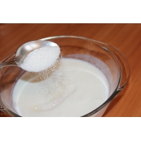 Для приготовления оладий на кефире в миске перемешайте кефир, сахар, соль, соду, погашенную уксусом.