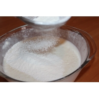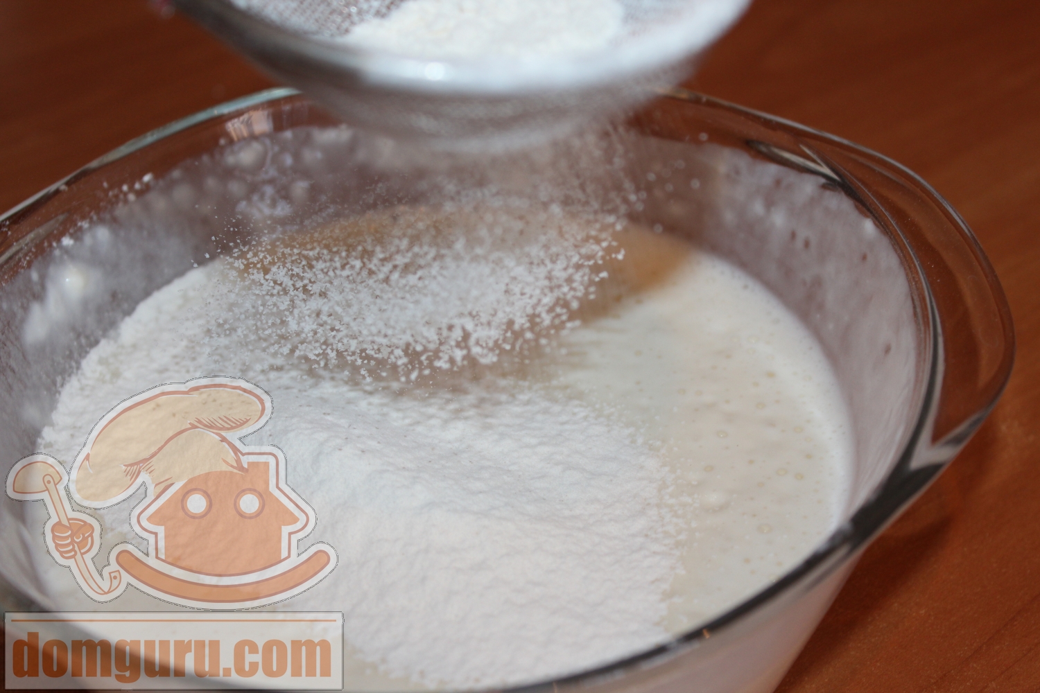 Затем, постоянно помешивая, подсыпайте муку — пока тесто не станет густым, как сметана.