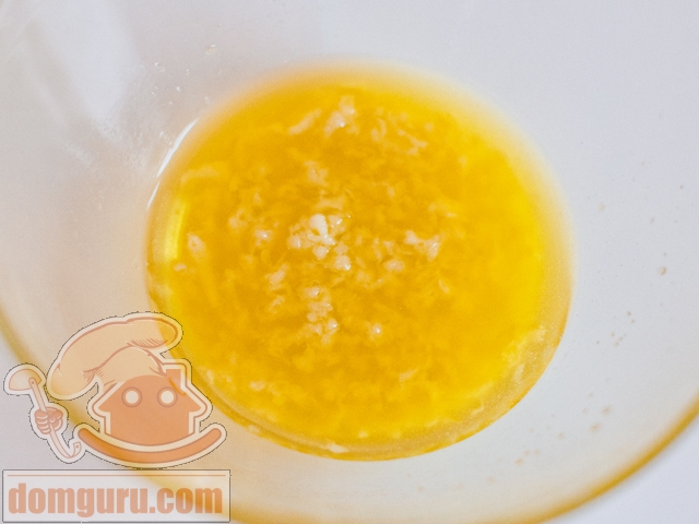 В пиалу налейте 3 ложки растительного масла, выдавите чеснок и добавьте 1/3 чайной ложки соли, все перемешайте и дайте настояться 10-15 минут.
