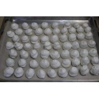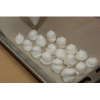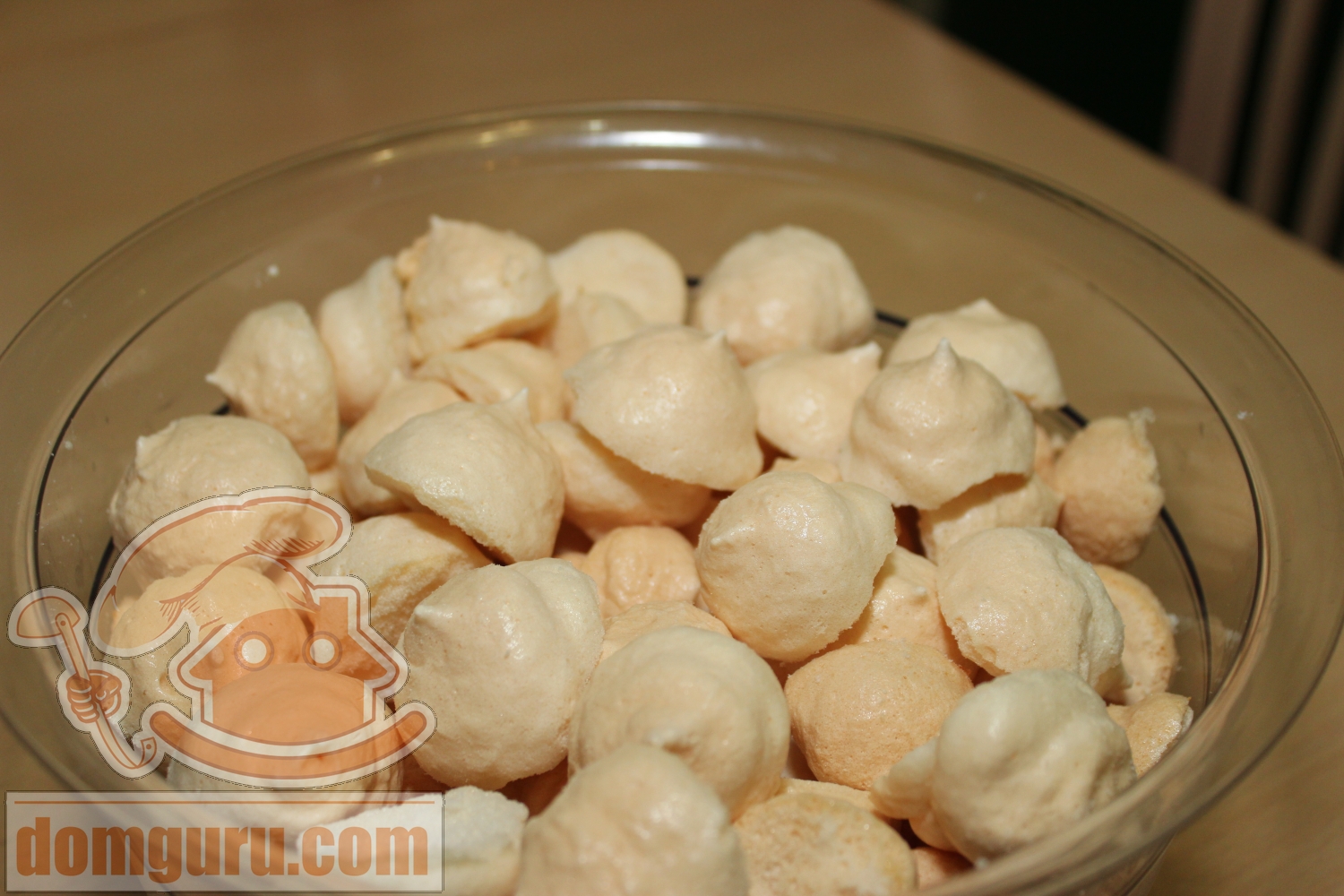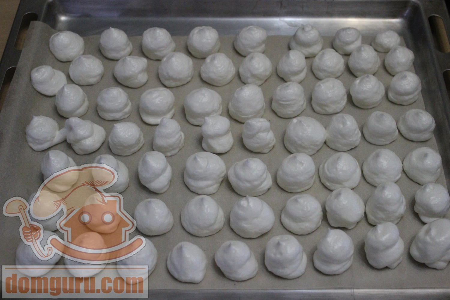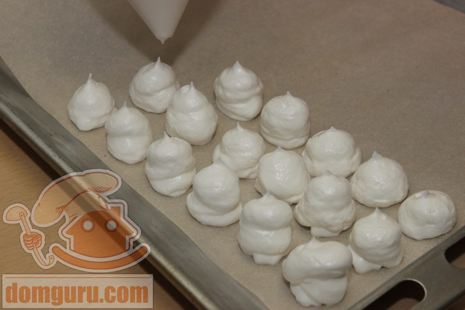 Возьмите 2 противня, застелите их пергаментной бумагой. Возьмите полиэтиленовый пакет, отрежьте у него кончик, выложите белки в него и выдавливайте на противень, придавая форму маковки. Можно выложить белки кондитерским шприцем.