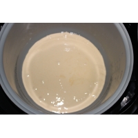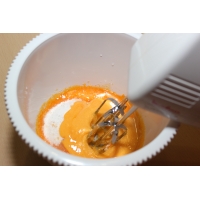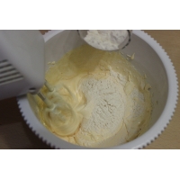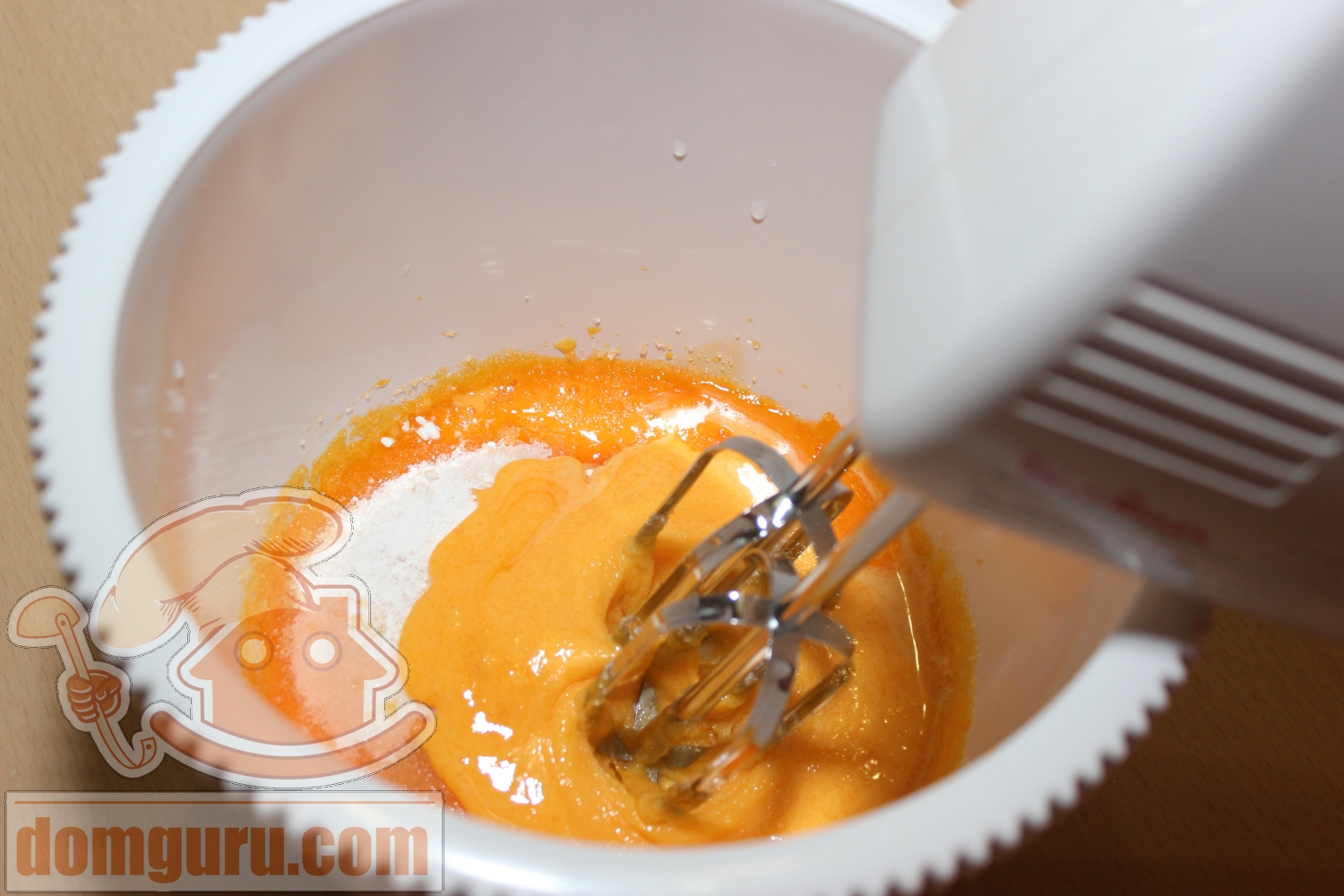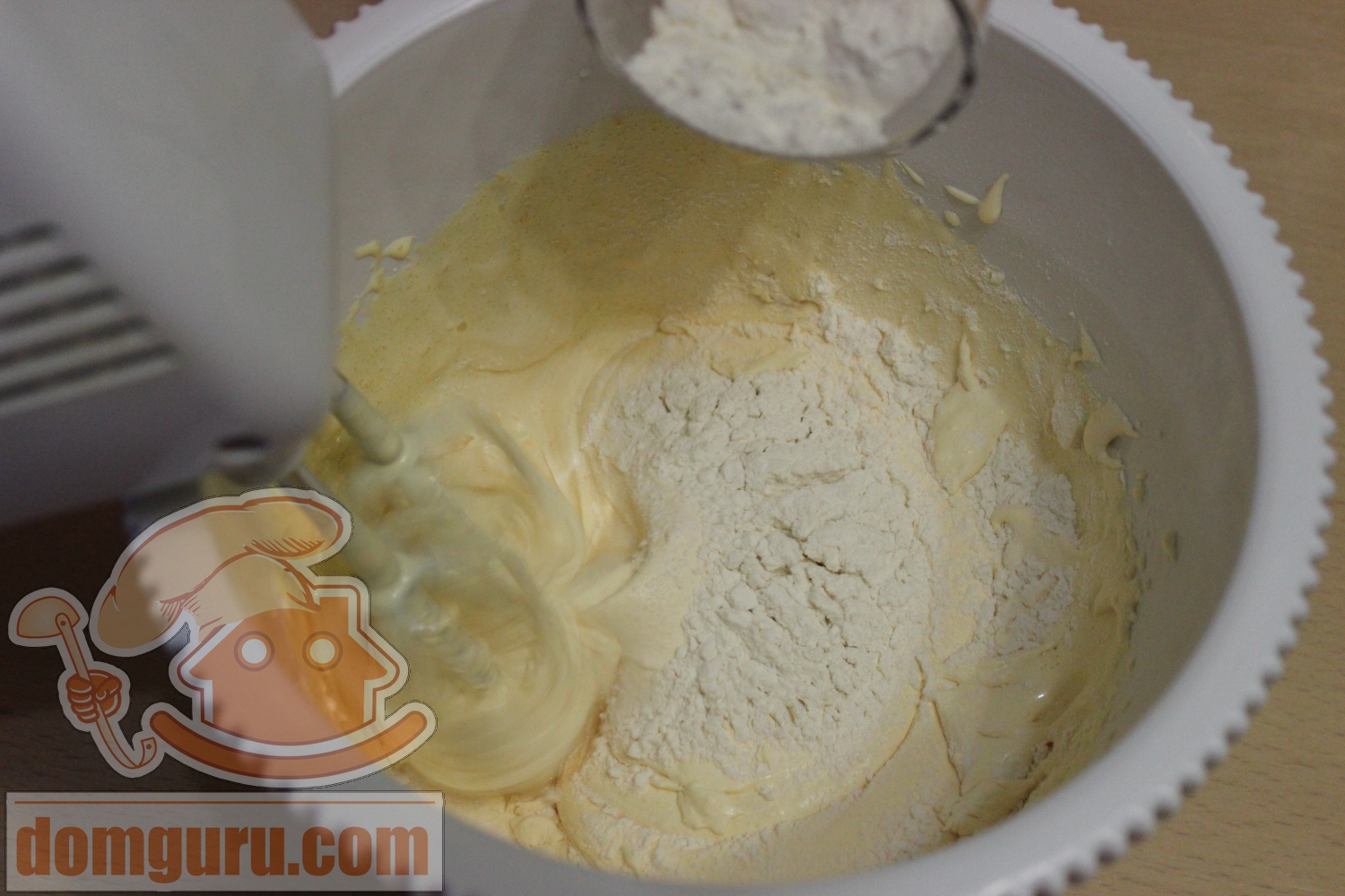 После того, как масса побелеет, добавьте стакан муки. Полученную массу хорошенько перемешайте до состояния теста.