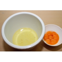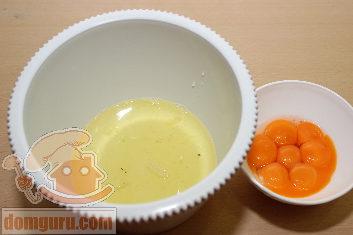 Возьмите желтки, добавьте к ним 80 грамм сахара и взбивайте, пока сахар не растворится и масса не побелеет