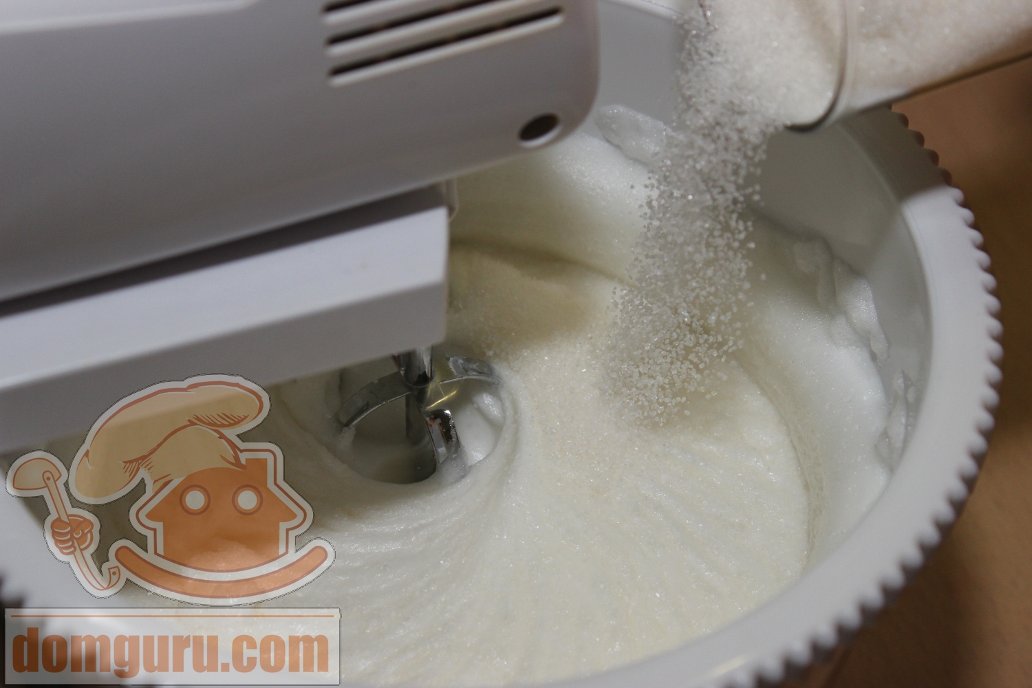 Взбейте миксером белки в густую пену и добавьте 100 грамм сахара.